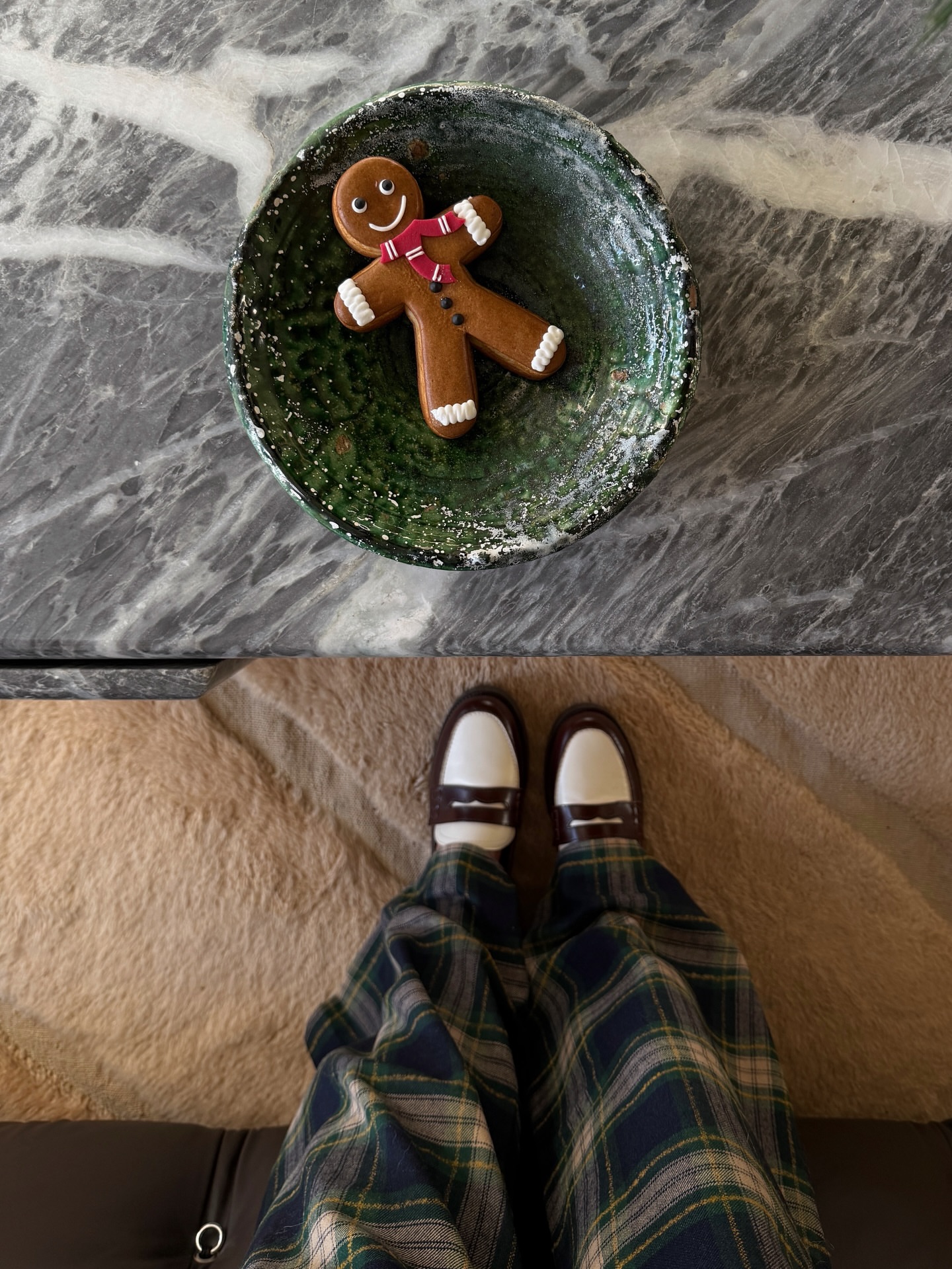 Centralni element dnevnog boravka je kamin u zelenim keramičkim pločicama, dok umjetnička djela, knjige i vintage komadi doprinose toplini prostora. Na stolu uvijek stoji buket cvijeća i mirisna svijeća, čineći dom živim i prijatnim.