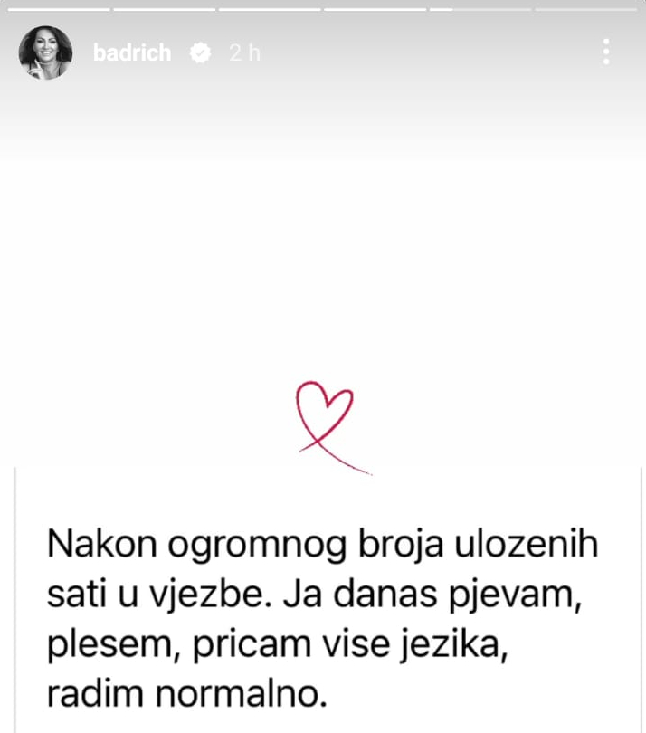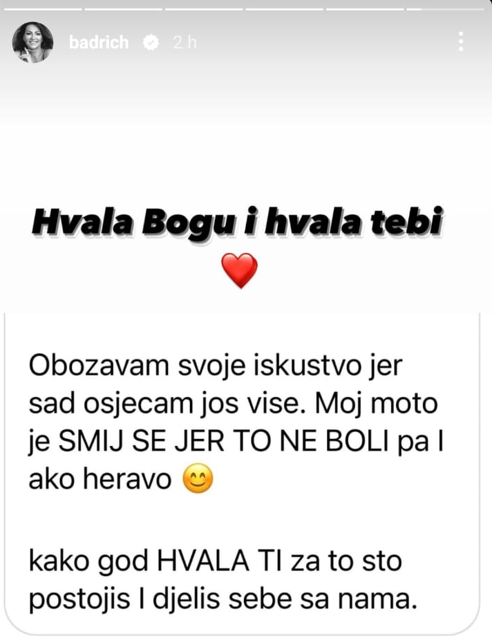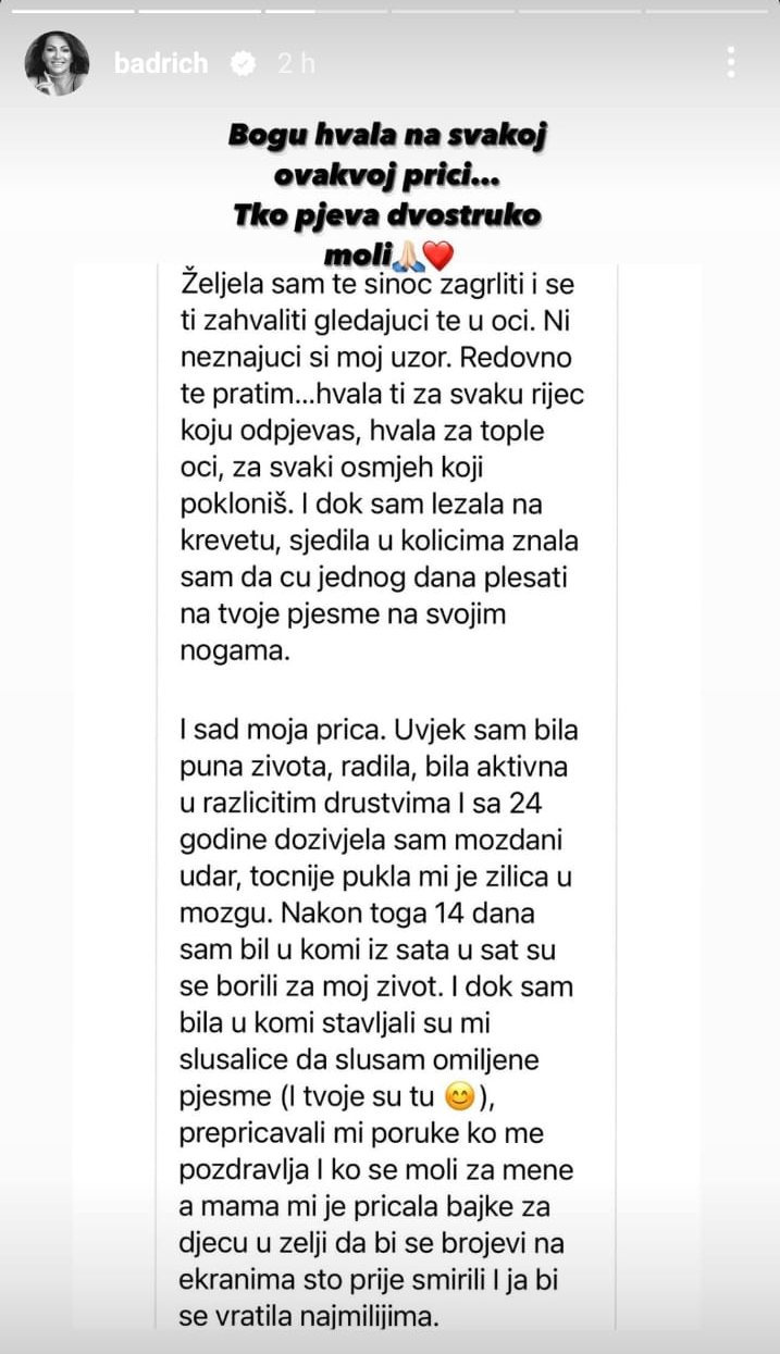 “Bogu hvala na svakoj ovakvoj priči, ko pjeva dvostruko moli”, poručila je pjevačica, a mladoj ženi posebno zahvalila: “Hvala Bogu i hvala tebi” poručila je uz emotikon srca.