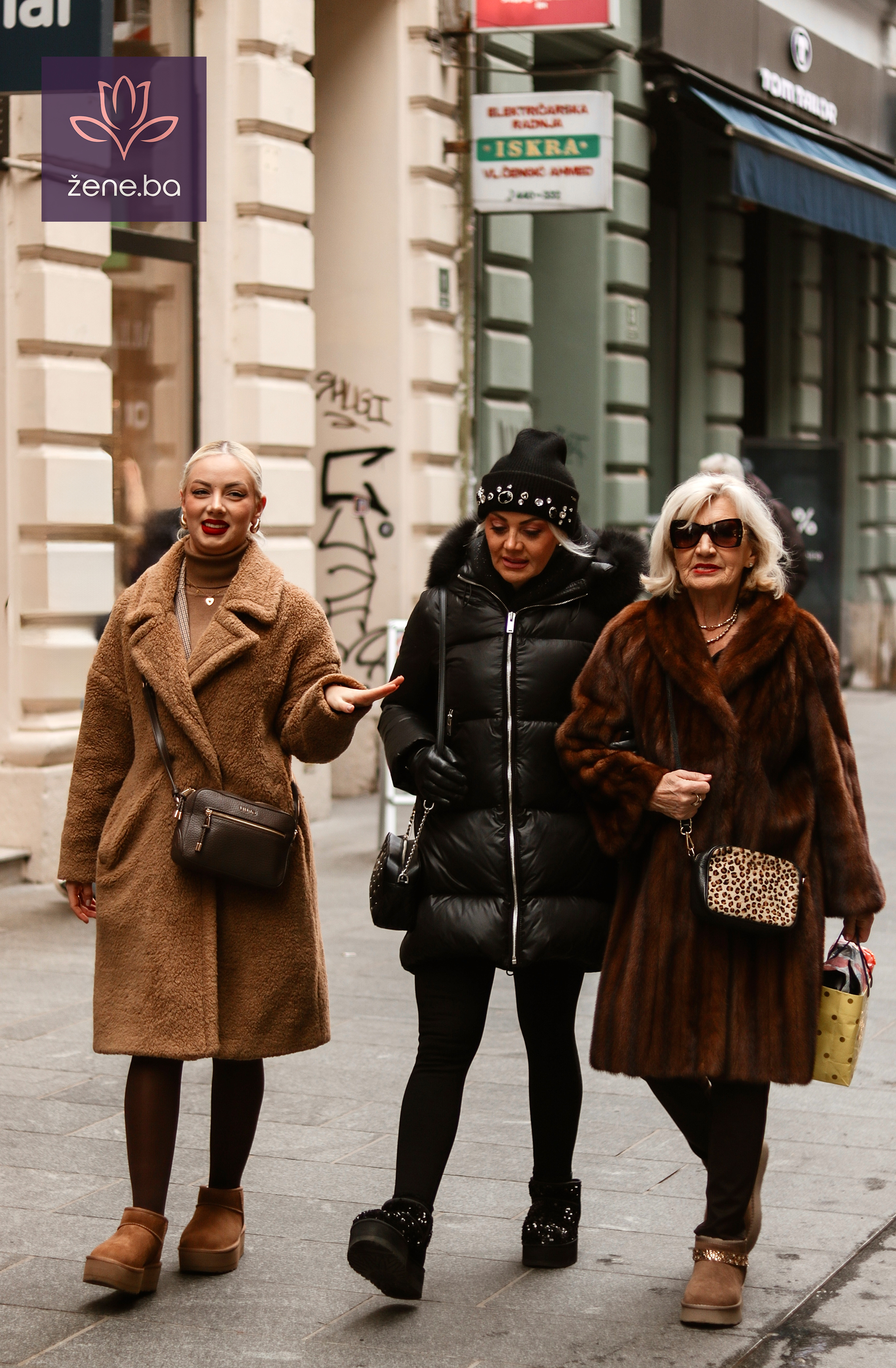 Na jednom od gradskih uglova zabilježili smo i tri dame različitih generacija u toplim zimskim kaputima. Njihova blaga usklađenost u tonovima i materijalima, te opušten način na koji koračaju kroz hladan dan, stvaraju prizor koji podsjeća kako se stil oblikuje tokom života — nenametljivo, ali sigurno.