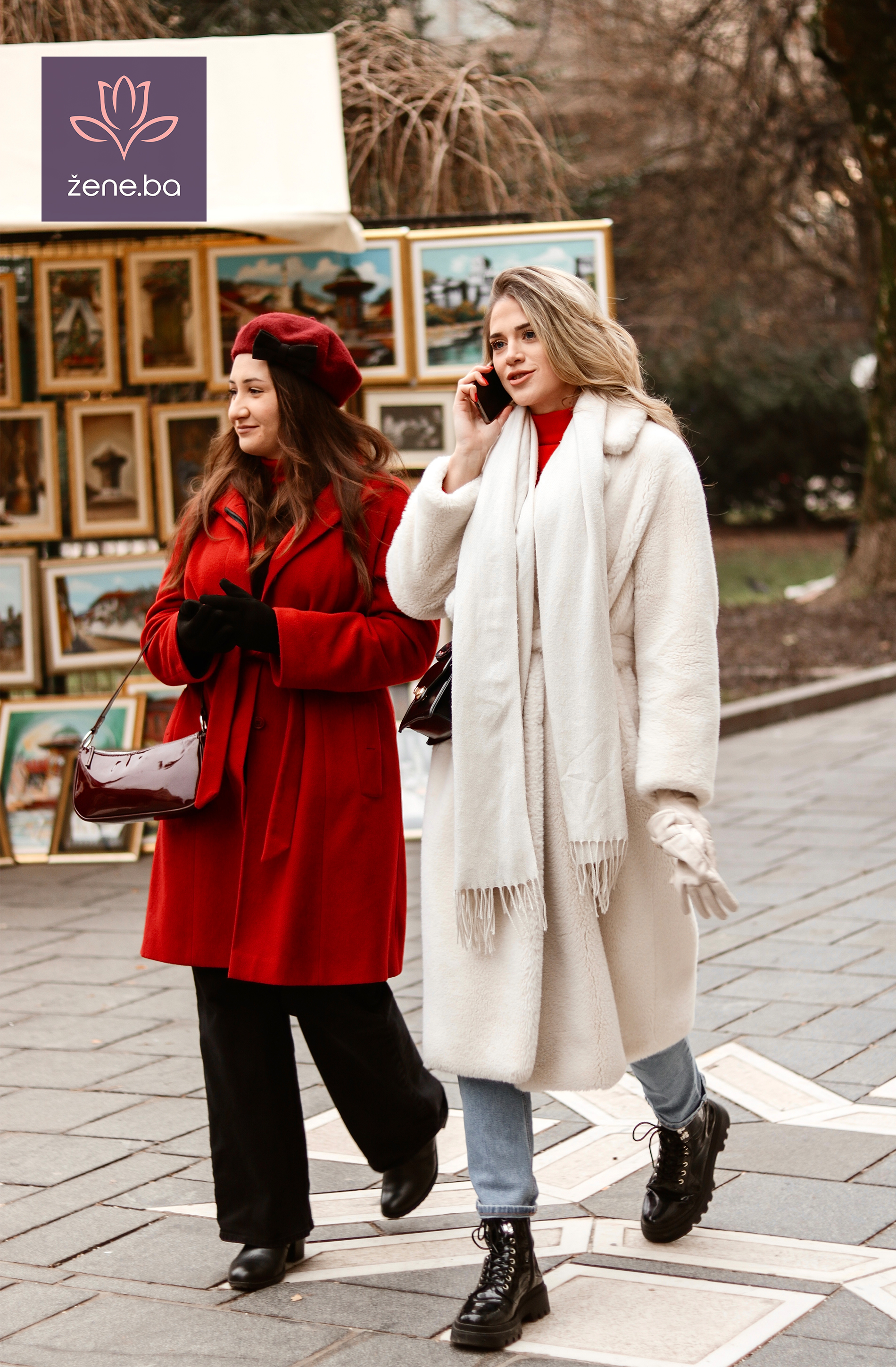 Dvije mlade žene prošetale su gradom i donijele drugačiju energiju. Jedna u jarkoj crvenoj, druga u mekoj bijeloj, zajedno stvaraju kontrast koji odmah privlači pogled. Njihove kombinacije djeluju kao mali prkos magli, poput dva koloristička naglaska u sivom gradskom danu.