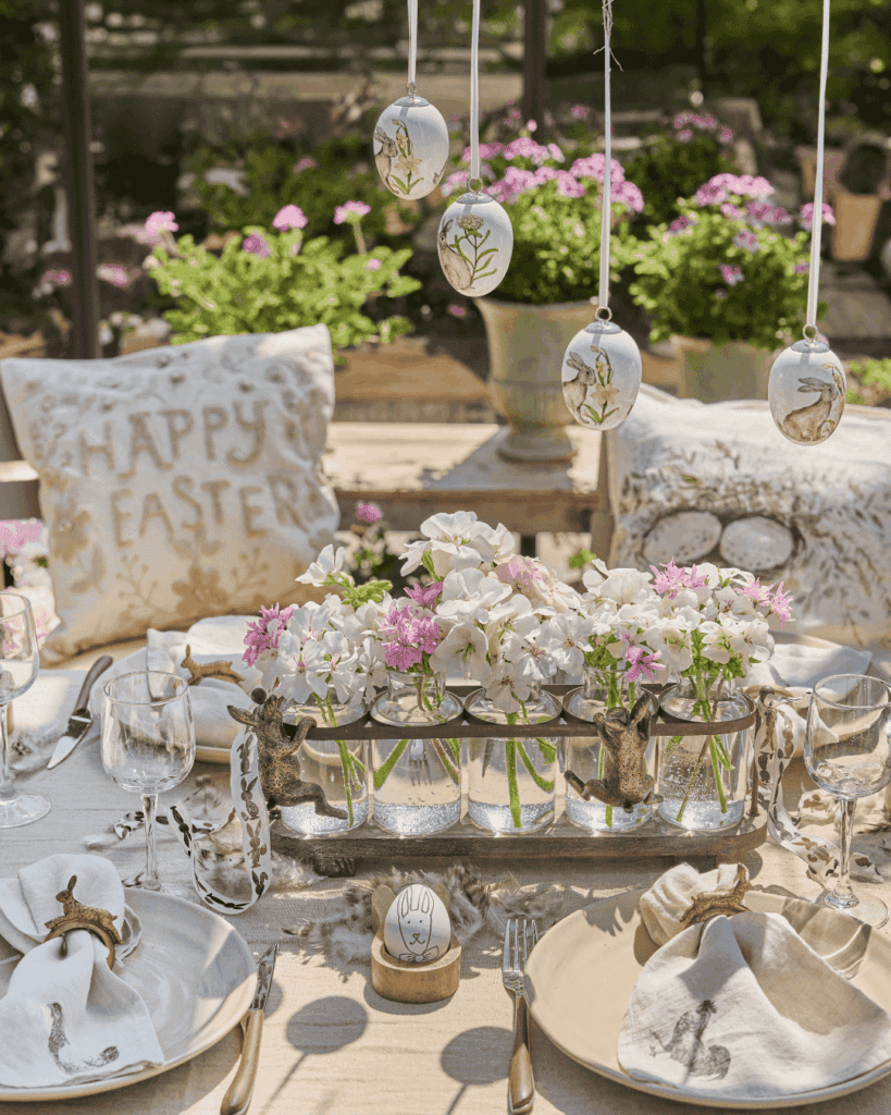 Središnji ukras stola može biti nekoliko vaza s različitim nijansama pelargonija. Postavite ih na rustikalni pladanj i dodajte detalje poput pisanica ili drvenih ukrasa. Rezultat je romantičan i šaren stol, savršen za blagovaonicu, terasu ili balkon. Za dodatnu igru, upotrijebite dekorativnog zeca ispunjenog malim cvjetovima ili kombinujte cvijeće s jastucima i salvetama u proljetnim motivima.