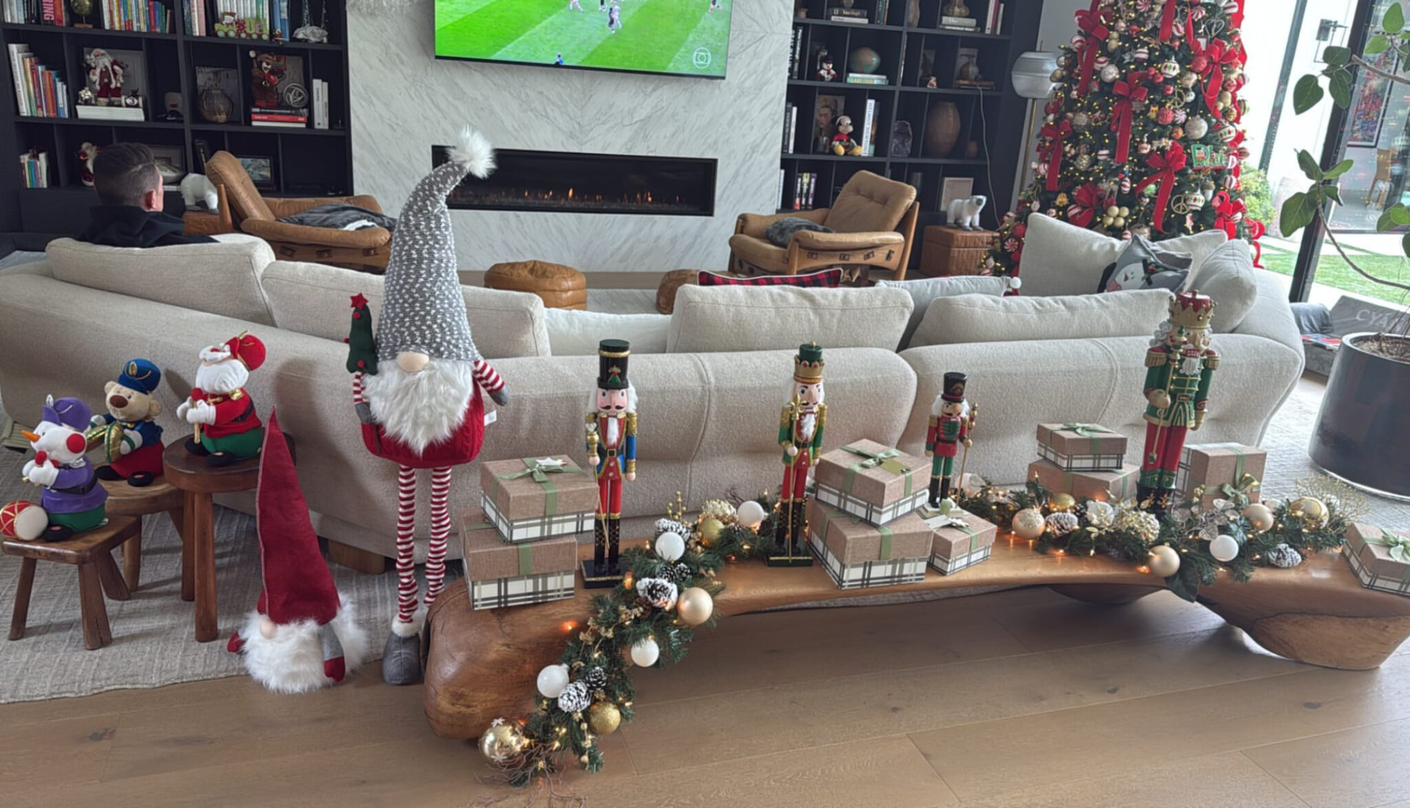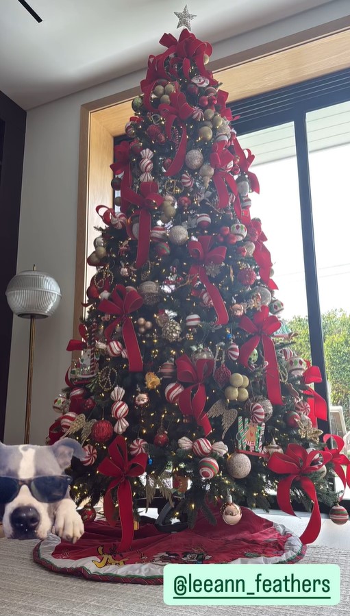 Centralno mjesto u dnevnoj sobi zauzima raskošna jelka koja se pruža do plafona. Prekrivena je zlatnim, zelenim i crvenim ukrasima, a masivne mašne daju joj poseban glamur. Čitava prostorija odiše prazničnim duhom – od dekorativnih lampica do pažljivo raspoređenih ukrasa na policama i komodama.