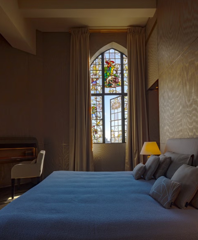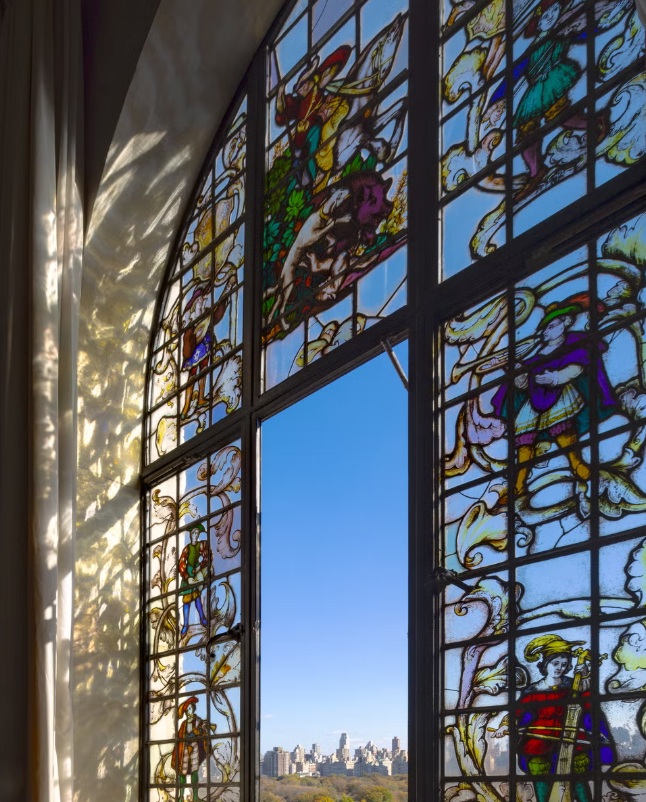 Poseban element stana čine originalni vitraji iz 1920-ih, koji podsjećaju na gotičke crkve. Prema predaji, arhitekti su pronašli inicijale Marion Davies urezane u kamin, što dodatno doprinosi legendi ovog prostora, budući da je nekadašnji vlasnik bio William Randolph Hearst. Međutim, i sam grad, na koji se pruža pogled iz ovih prozora, sastavni je dio Armanijeve priče.