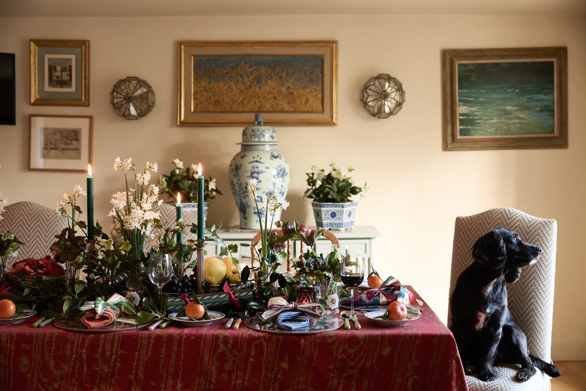 U domu Amande Brooks u Cotswoldsu dominiraju crvene nijanse na blagdanskom stolu, stvarajući osjećaj topline.