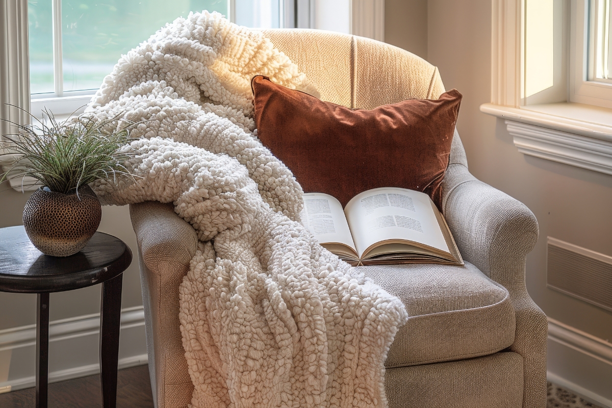 mekana vunena deka na naslonu stolice, jastučići od grubog platna, drvena zdjela sa svježim voćem ili ručno rađena šolja.