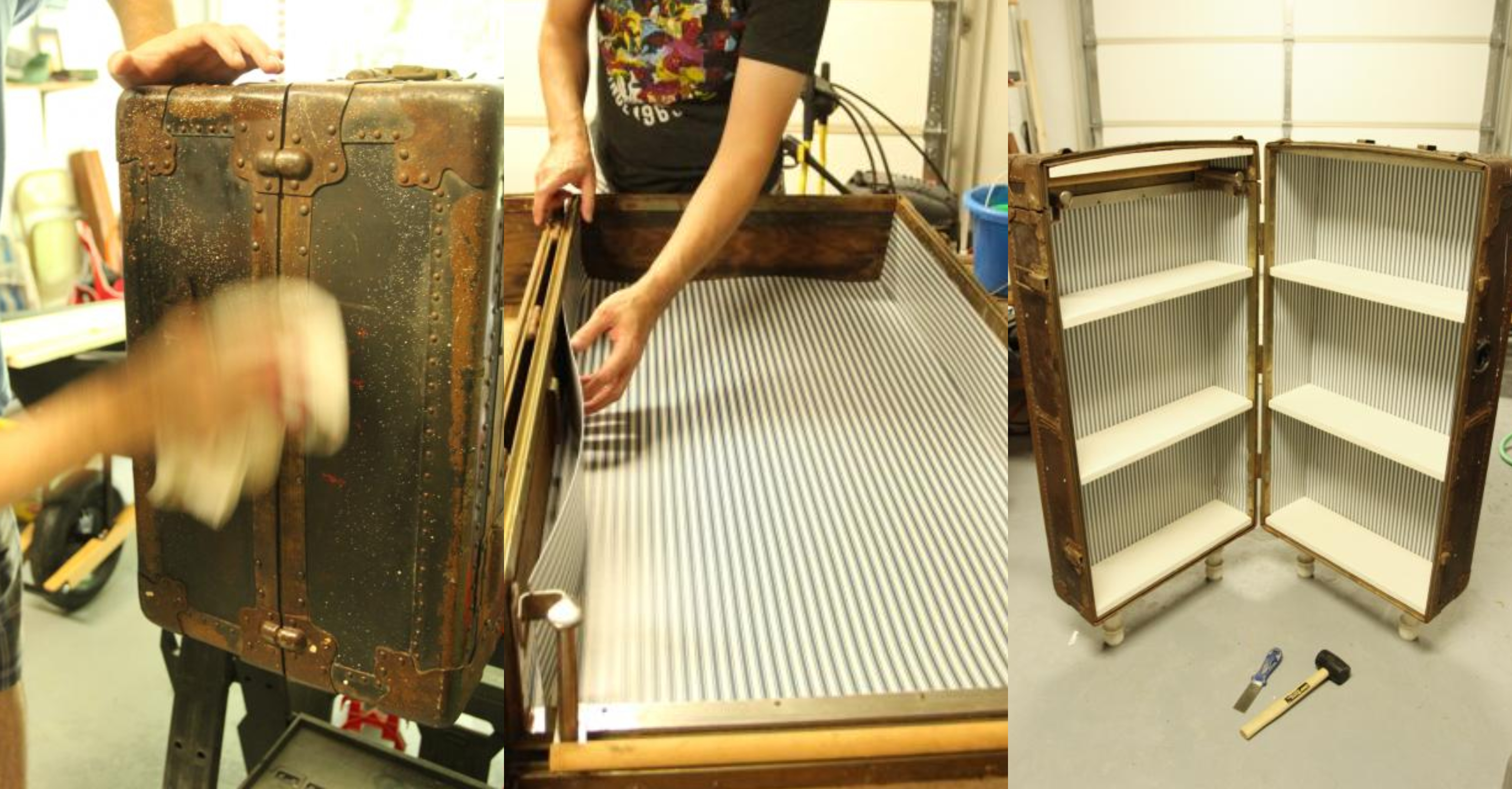 Po želji, obojite vanjštinu ili ostavite originalni vintage izgled. Odaberite poziciju na zidu i označite gdje će ići tiple. Uz pomoć libele označite ravan položaj kofera.