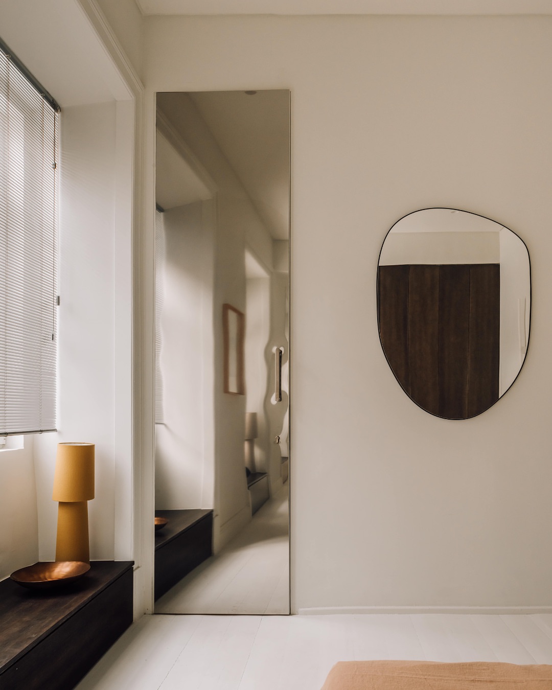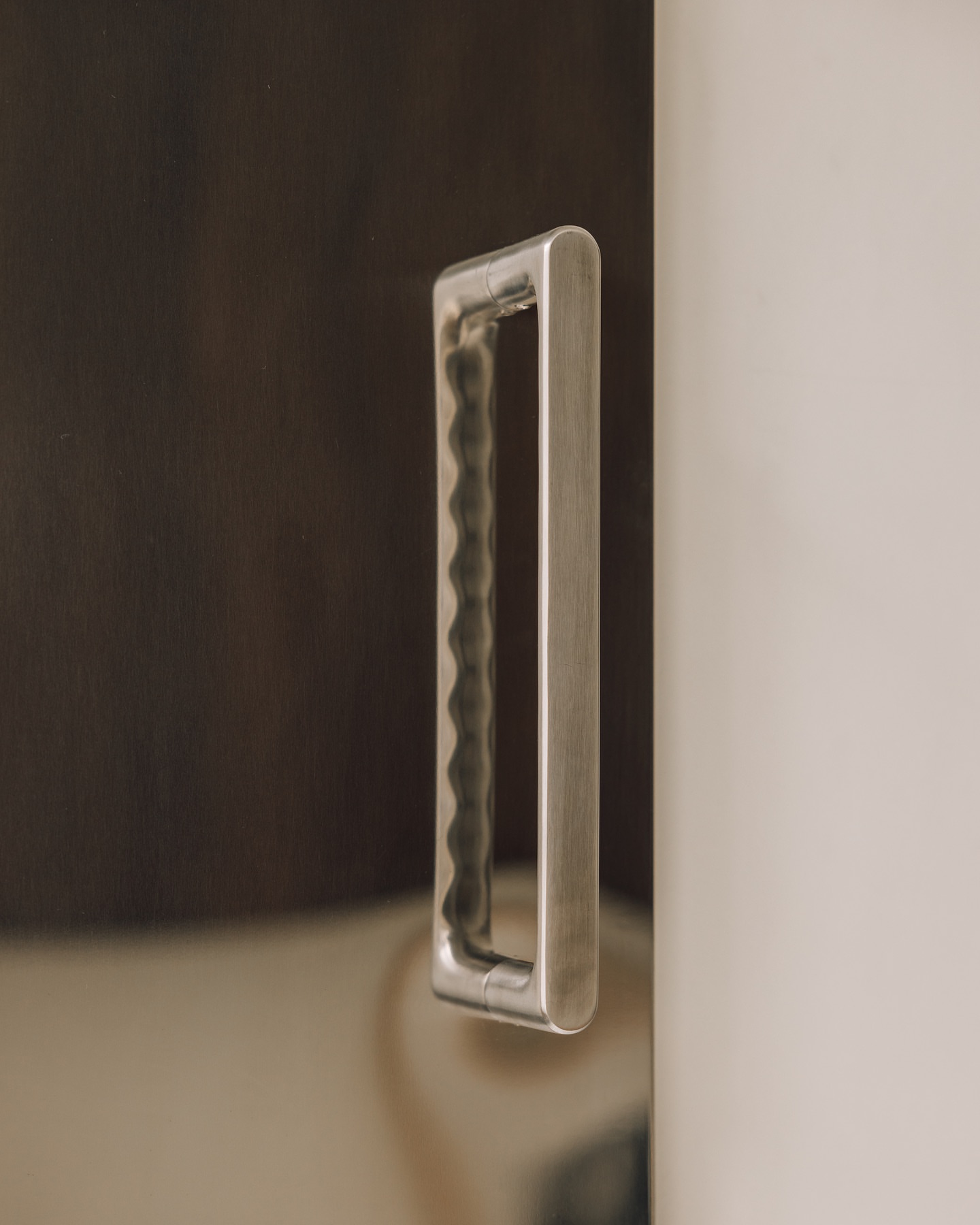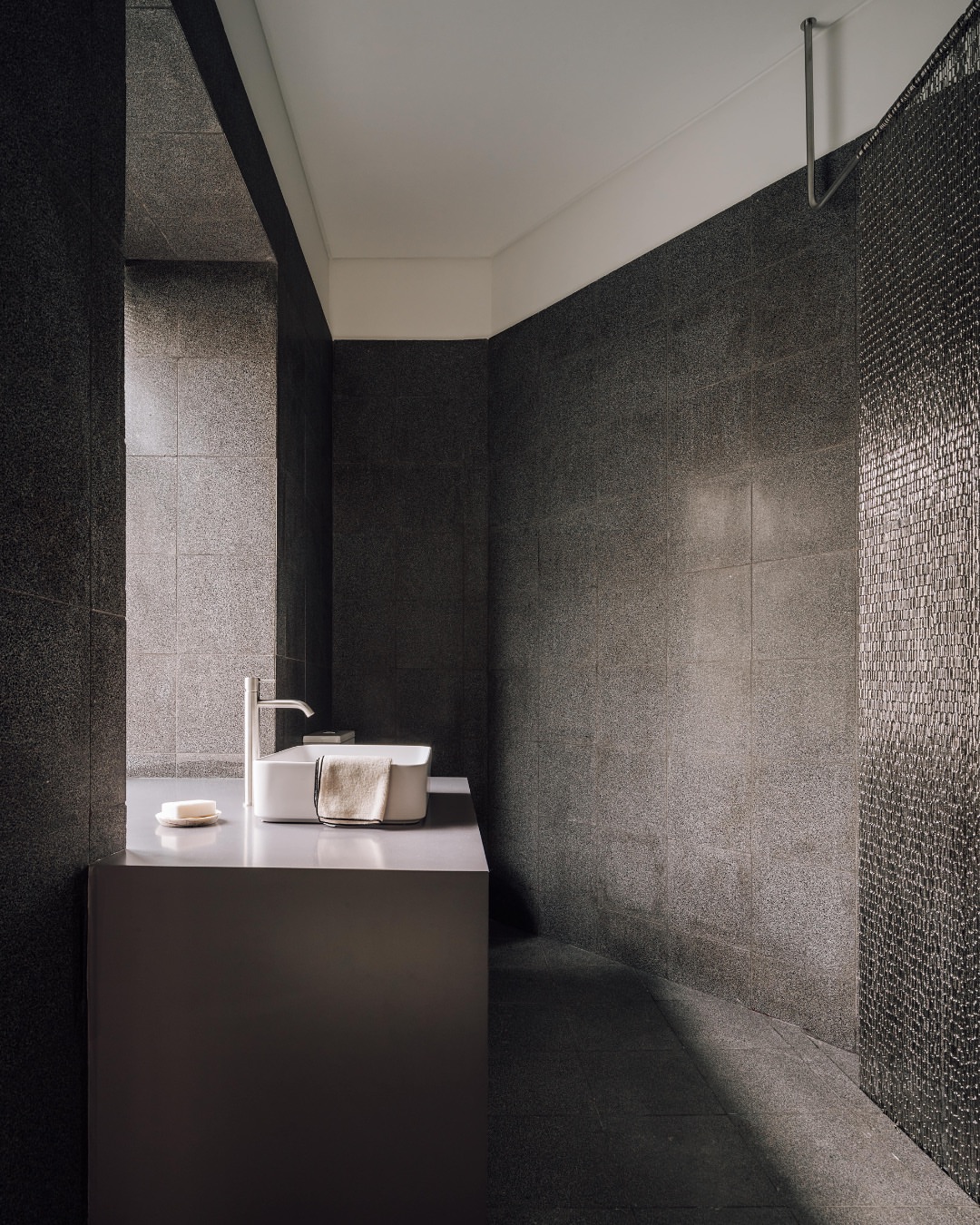 Spavaća soba s niskim krevetom pruža privatni kutak za odmor, a walk-in ormar s luksuznim podom pretvara svakodnevno oblačenje u intimnu i ritualnu aktivnost. Kupaonica s terrazzo pločicama i tamnom bazom stvara mirnu, gotovo meditativnu atmosferu, dodatno pojačanu zvučnim efektima tuša od nehrđajućeg čelika.