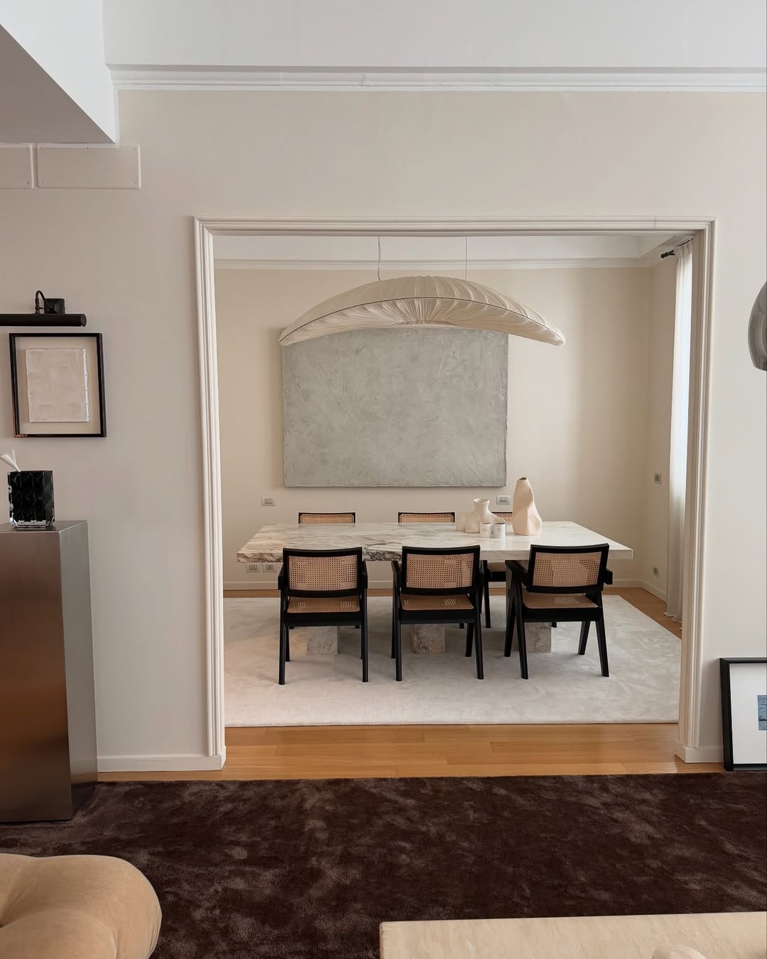 Tamara opisuje trpezariju kao stvarno umjetničko rješenje — centralni element prostora je mermerni stol impozantnih dimenzija, a iznad njega visi luster neobičnog oblika. Čak i dekor na zidu i zavjese, birani su da budu suptilni i što jednostavniji.