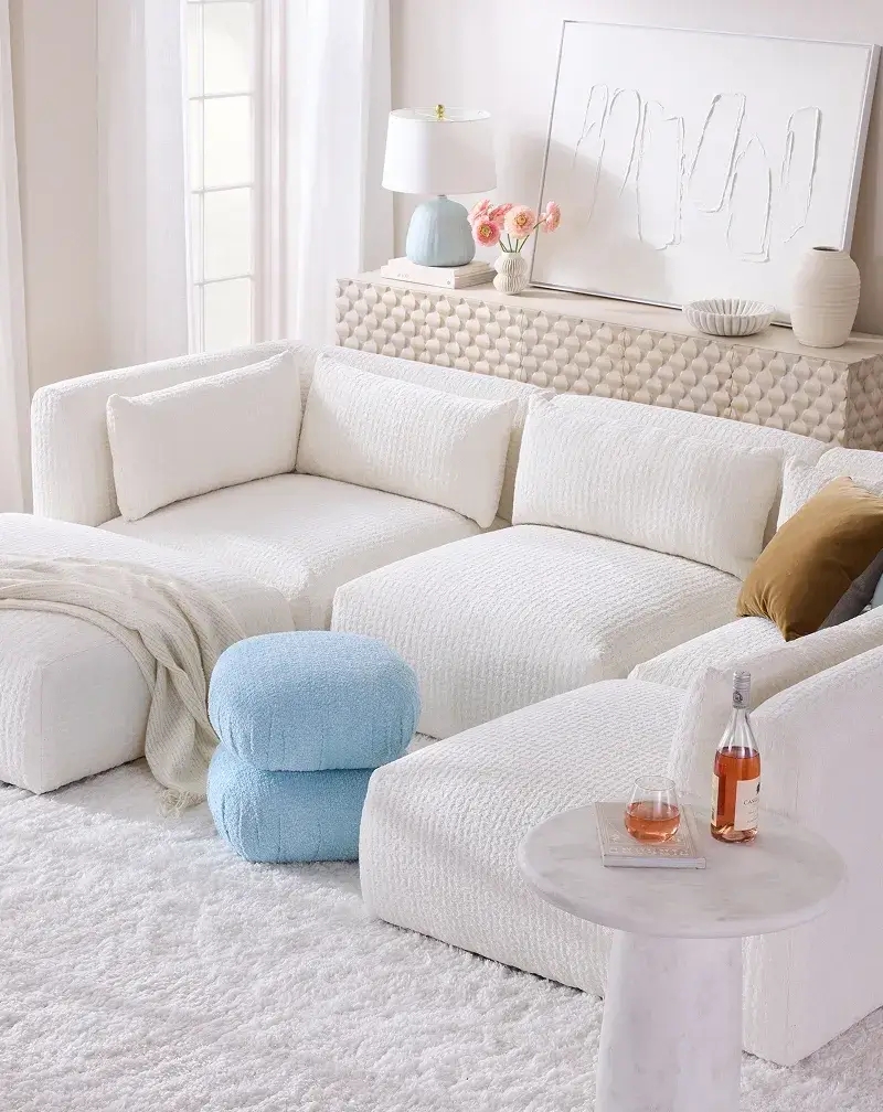Za veći efekat, sofe ili kreveti u Cloud Dancer nijansi djeluju izuzetno luksuzno i elegantno.