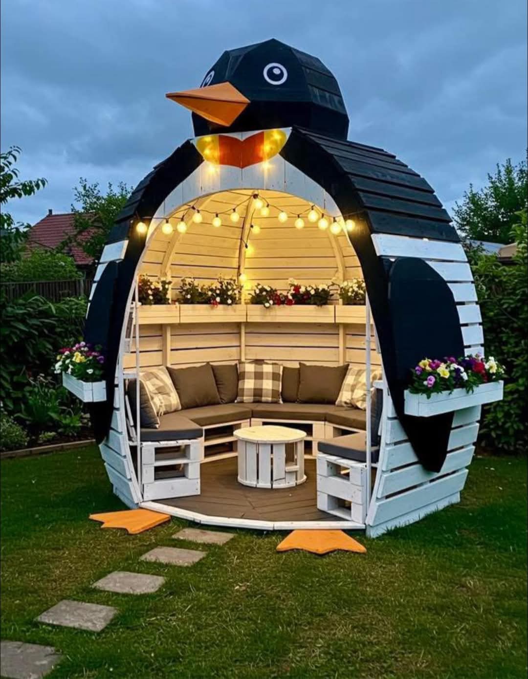 Zamislite večernje druženje u vrtu, smješteni unutar ogromnog drvenog pingvina! Ova simpatična kućica sa svjetlucavim lampicama i udobnim jastucima pravi je raj za opuštanje. Idealna za porodična okupljanja, dječje rođendane ili jednostavno da unesete malo humora i topline u svoj vrt.