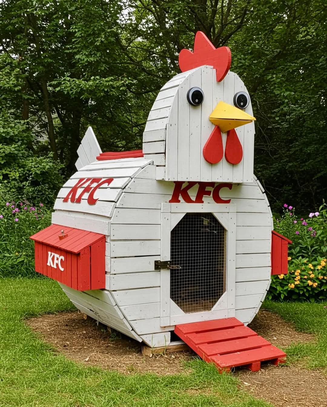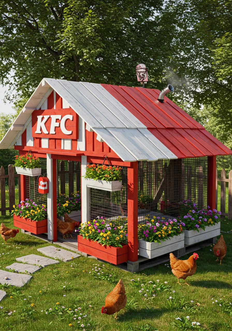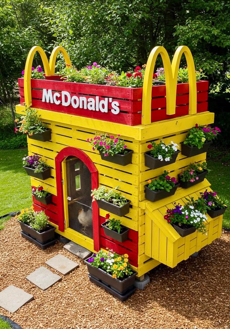 Za sve ljubitelje šaljivih detalja, kokošinjac inspirisan McDonald'som je totalni hit! Sa žutim i crvenim daskama, mini cvjetnim loncima i velikim “M” znakom, vaše kokoške će postati prave zvijezde dvorišta. Osim što je praktično, ovaj kokošinjac unosi veselje i boju u svaki vrt.