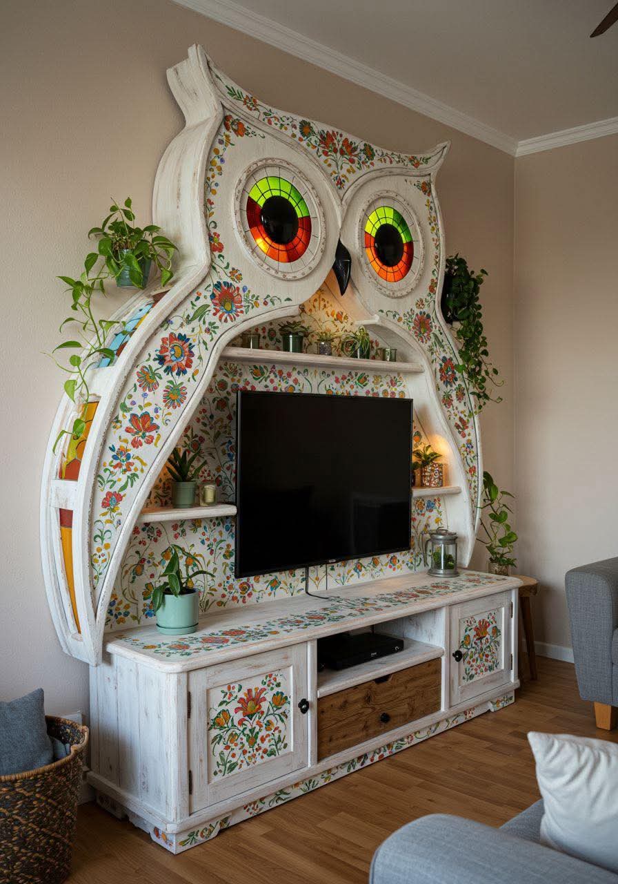 Za interijer koji ostavlja bez daha, pogledajte ovu ručno rađenu policu u obliku sove! Bogato ukrašena cvjetnim uzorcima, sa vitražnim detaljima u očima, ova polica je savršena za ljubitelje rustikalnog, etno i boho stila. Smjestite je iza televizora ili na zid gdje želite unijeti umjetnički pečat.