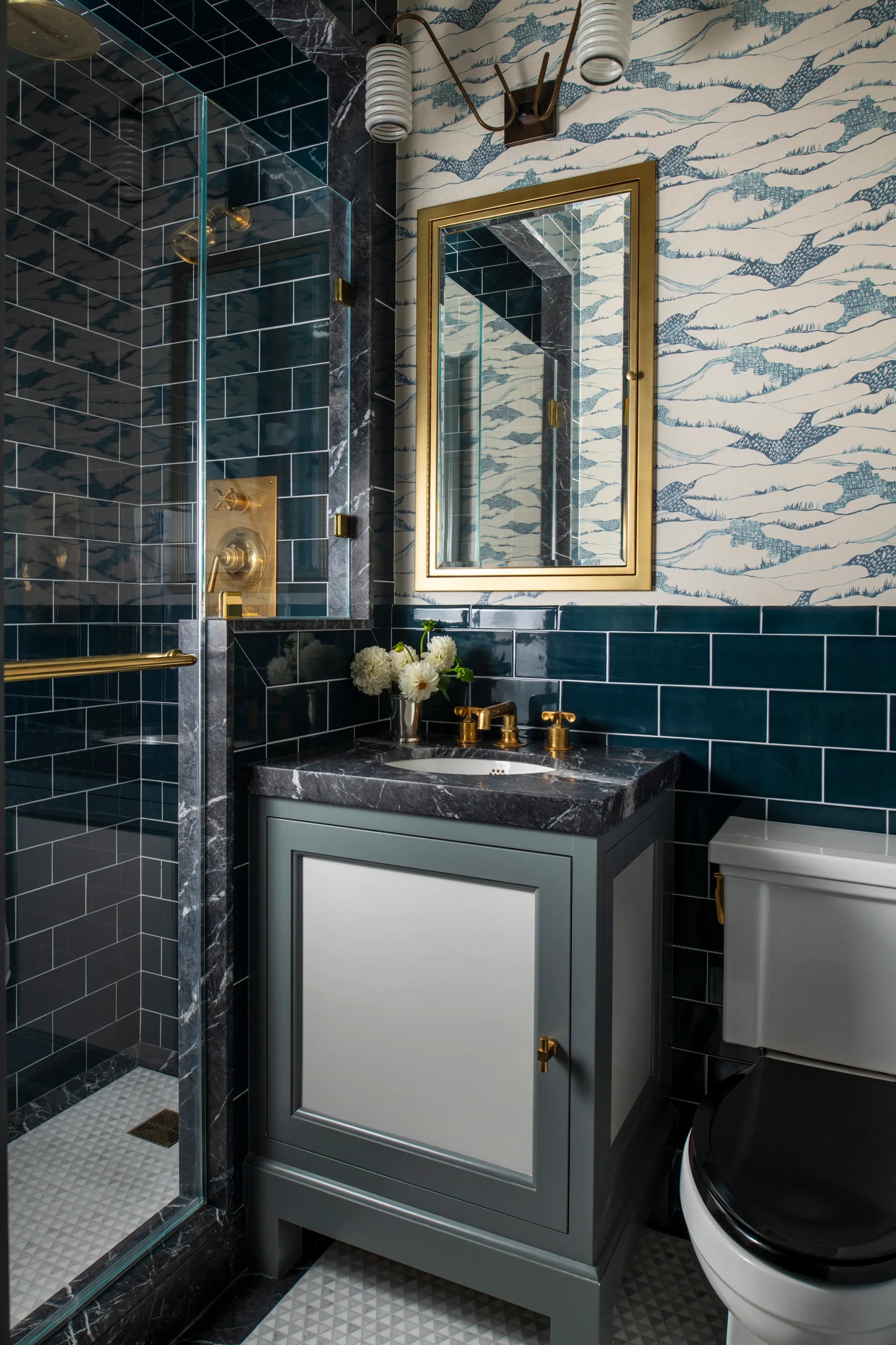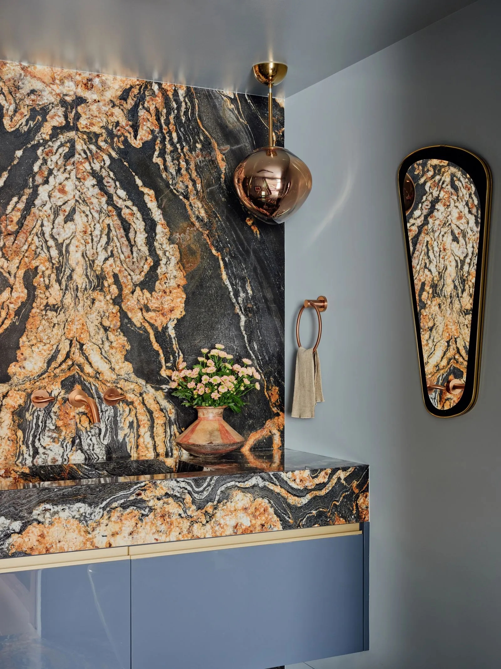 Spoj mramora i prigušene plave boje nikada ne izlazi iz mode. Ako birate mramorne ploče sa sivim ili plavičastim žilicama, nijansa ormarića ili pločica može ih savršeno dopuniti i povezati cijeli prostor.