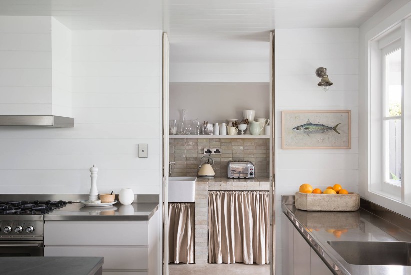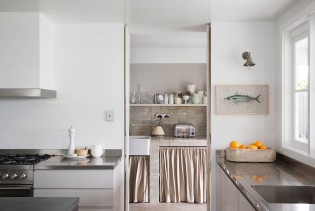 Jedan od detalja koji se neočekivano vraća u fokus jeste korištenje tkanine umjesto klasičnih kuhinjskih fronti — najčešće ispod sudopera ili otvorenih polica.
