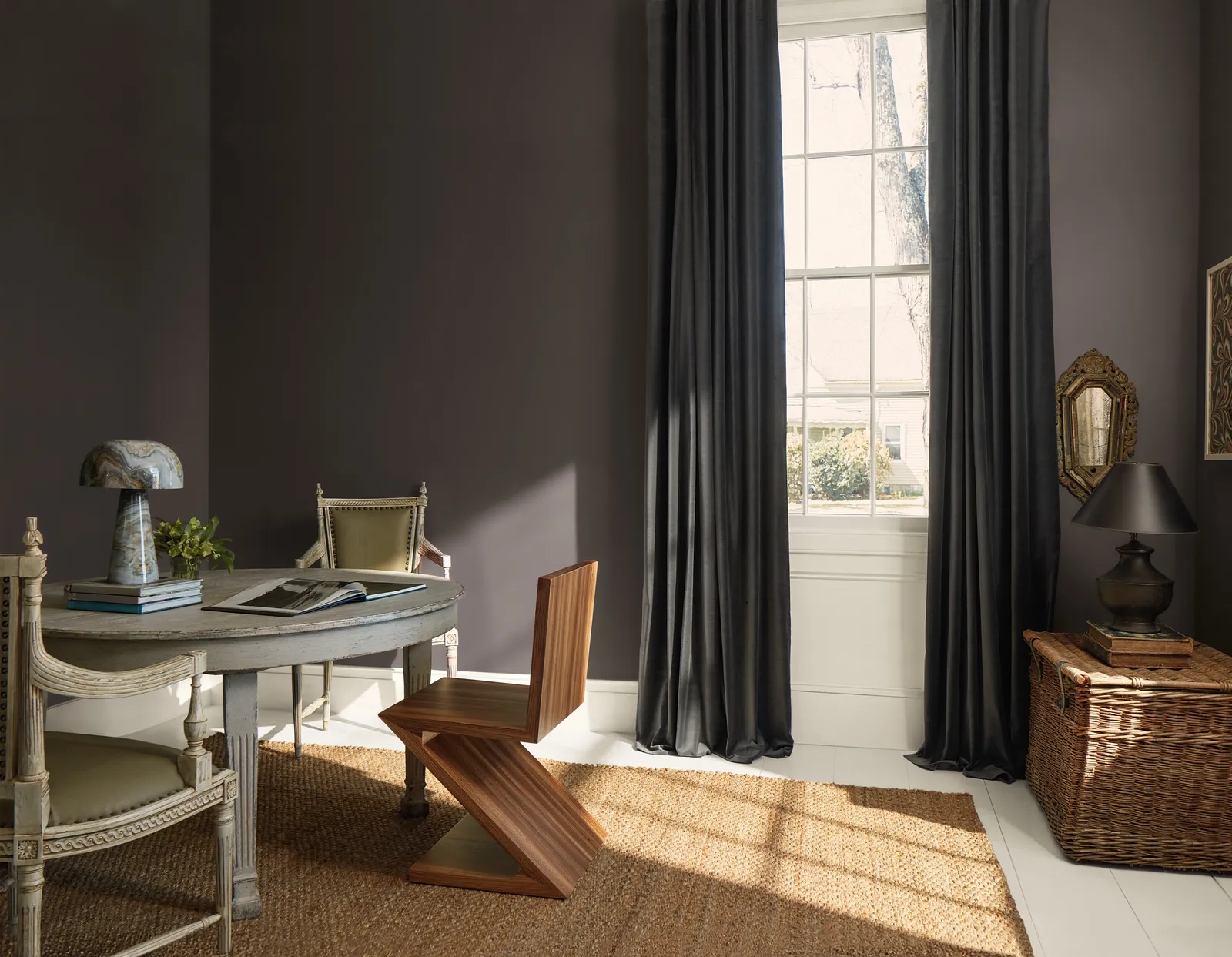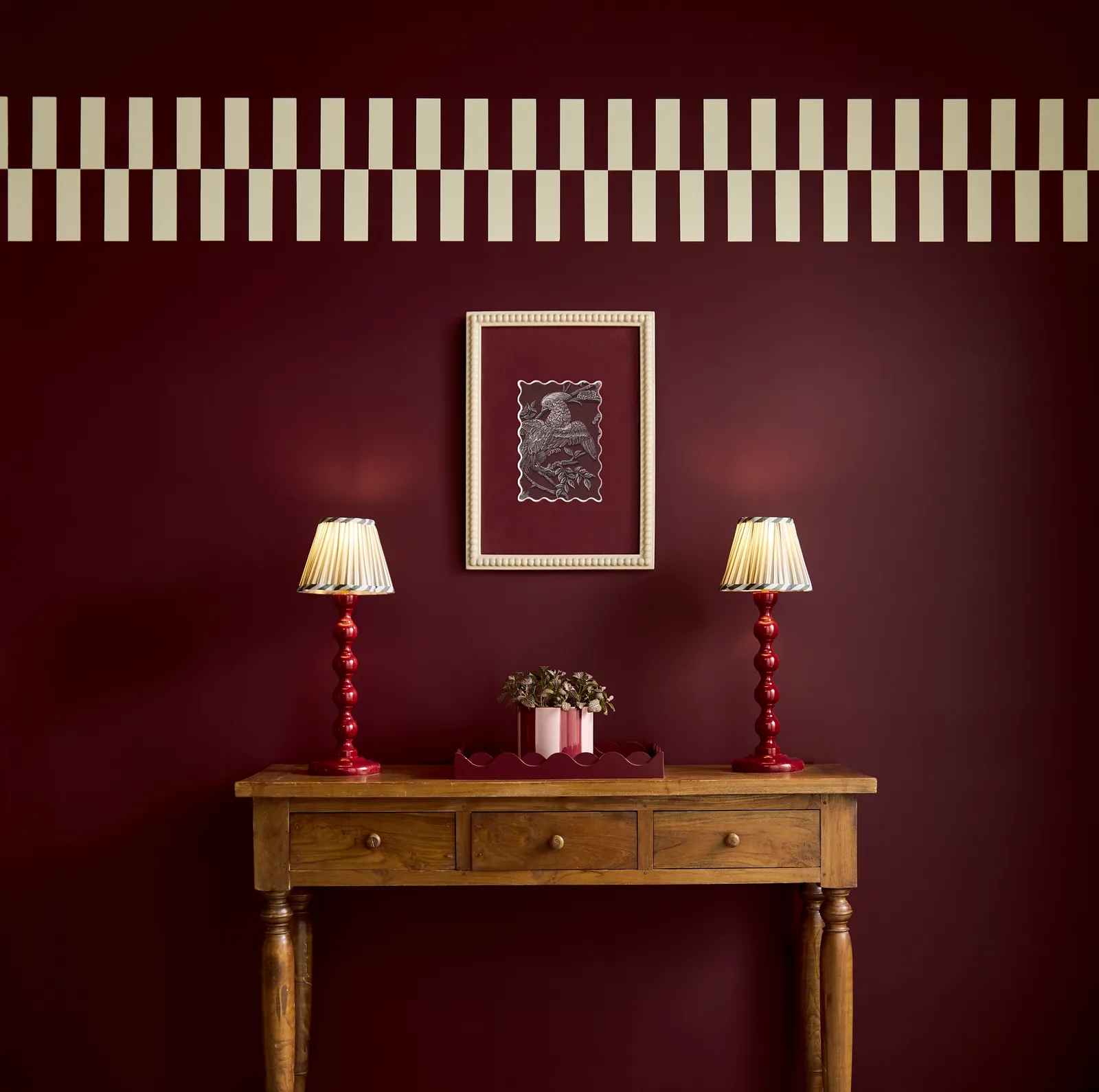 Divine Damson je raskošna nijansa burgundca s notama zrelog voća. Mijenja se ovisno o osvjetljenju – ponekad djeluje zemljano, a ponekad življe i crvenije. U kombinaciji s dekorativnim uzorcima poput Eternal Weave tapeta, ova nijansa donosi osjećaj bogatog, ali uravnoteženog ambijenta, idealnog za ljubitelje maksimalizma.