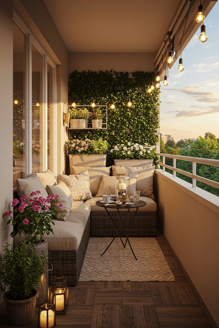 Za sjedenje razmislite o klupi uz zid ili ogradu – uz nekoliko jastuka, dobit ćete udoban kutak za opuštanje bez da izgubite dragocjeni prostor. Ako vam balkon ima bočne stranice, sanduci obloženi jastucima mogu poslužiti i kao sjedalo i kao prostor za pohranu.