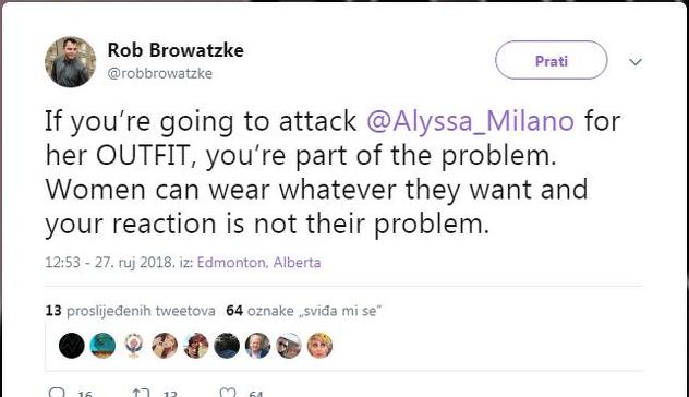 "Ako ćete napasti @Alyssa_Milano samo zbog outfita vi ste u problemu! Žena može nositi šta želi i vaše reakcije nisu njen problem", glasio je jedan od kometara koji je branio poznatu glumicu.