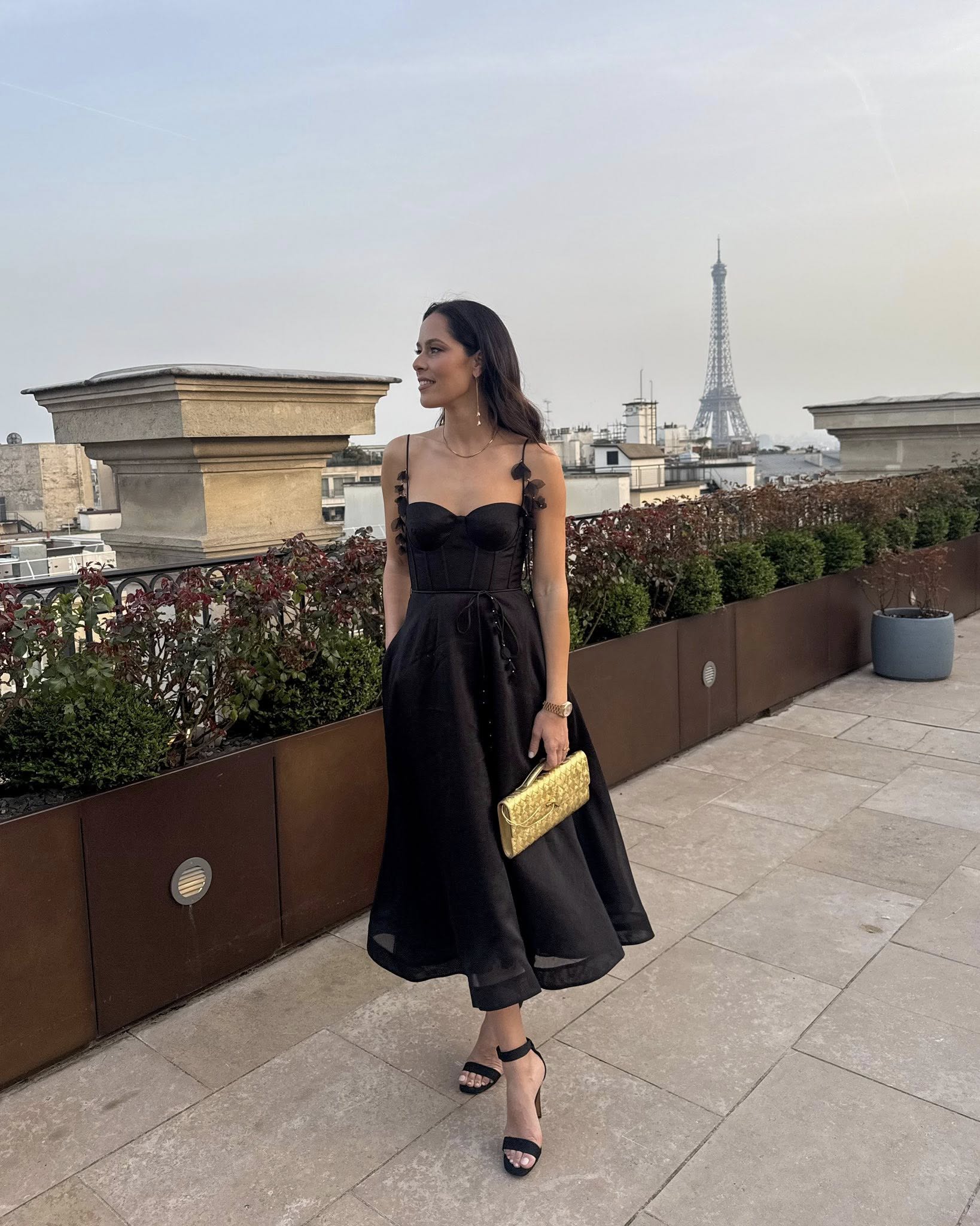 Haljina ima tanke naramenice ukrašene malim aplikacijama nalik listovima. Kombinaciju je upotpunila crnim visokim potpeticama i zlatnom torbicom.