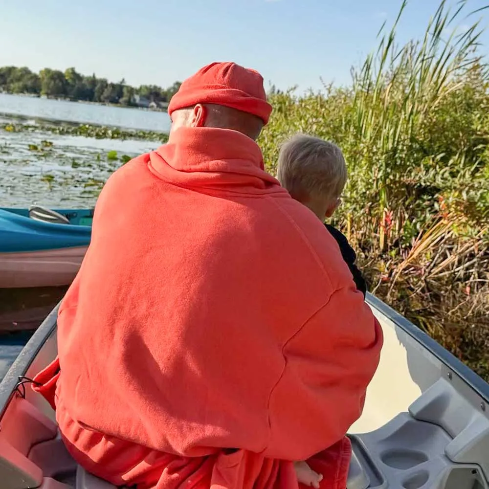 Justin je nosio crvenu kapu, crvenu duksericu i trenerku. Na fotografiji je Jack sjedio ocu u krilu, okrenut prema vodi.