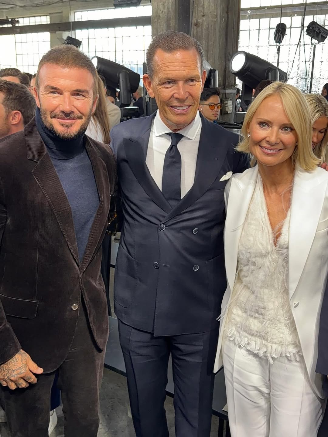 Prije nego što je prisustvovao reviji, Beckham je na balkonu hotela pozirao samo u donjem vešu, pokazujući definisan torzo i tetovaže.