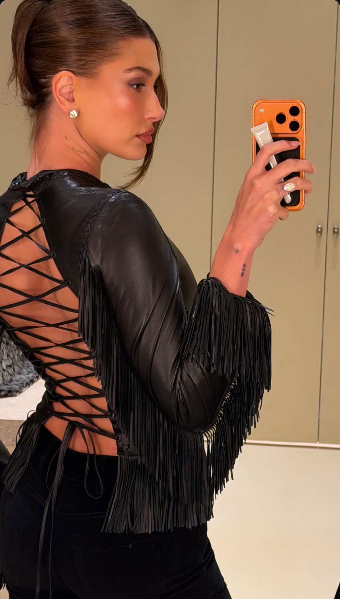 Hailey je također pokazala svoj outfit – modna ikona nosila je crni kožni top bez leđa sa resicama i crne pantalone.