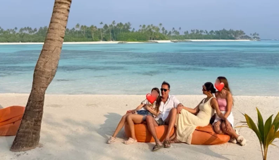 Na slici se vidi kako Sergej sa suprugom Kristinom i njihovim kćerkama Lolom i Milom uživa na pješčanoj plaži, opušteno sjedeći na lazy begovima uz more.