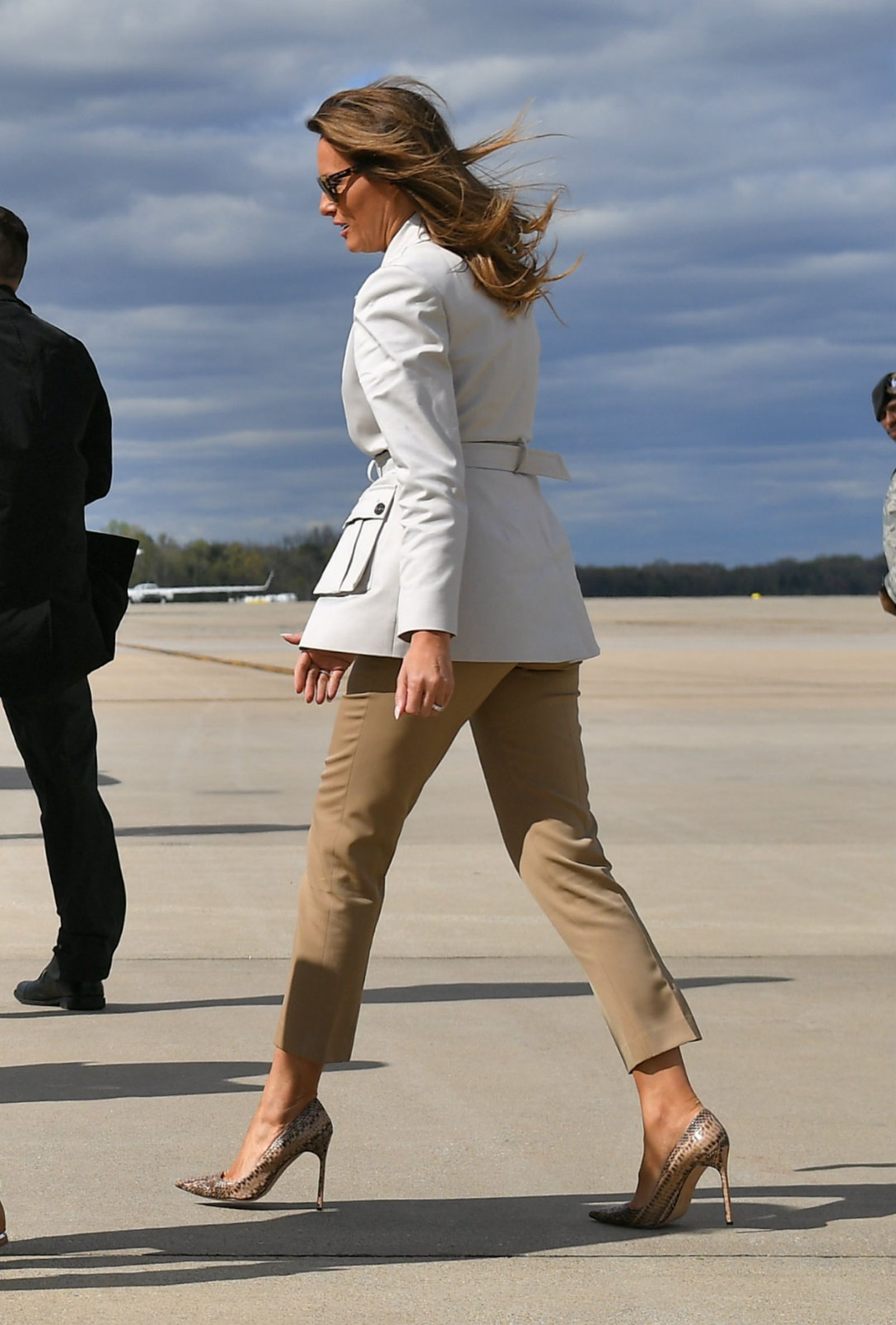 Očekivano, u prvom planu bila je Melania koja je u Sjevernu Karolinu stigla u jednostavnoj kombinaciji sastavljenoj od bež hlača klasičnog kroja, svijetlosive jakne i štikli sa životinjskim uzorkom.
