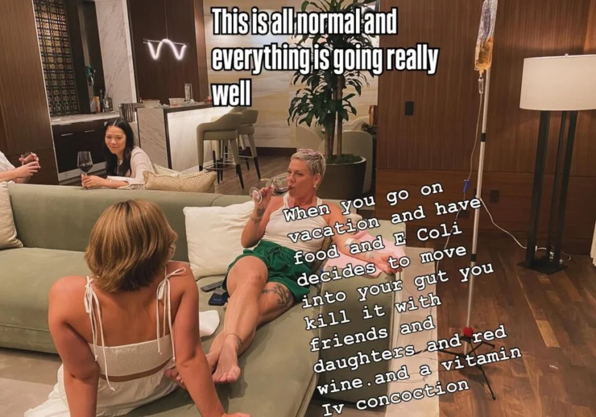 "Kad odeš na odmor i jedeš, a E. coli odluči da se preseli u tvoja crijeva, ‘ubiješ’ je druženjem s prijateljima, kćerkama, crnim vinom i vitaminskom infuzijom", napisala je.