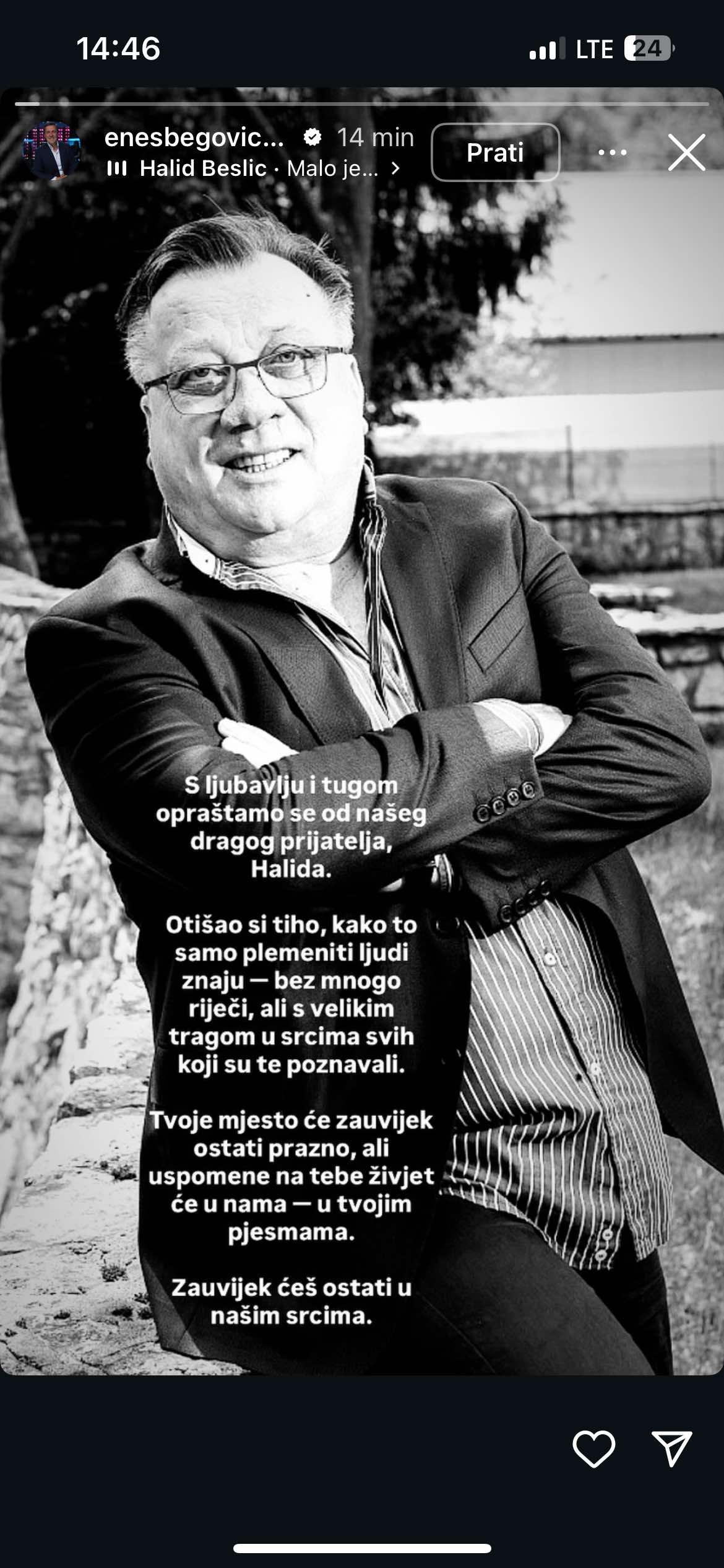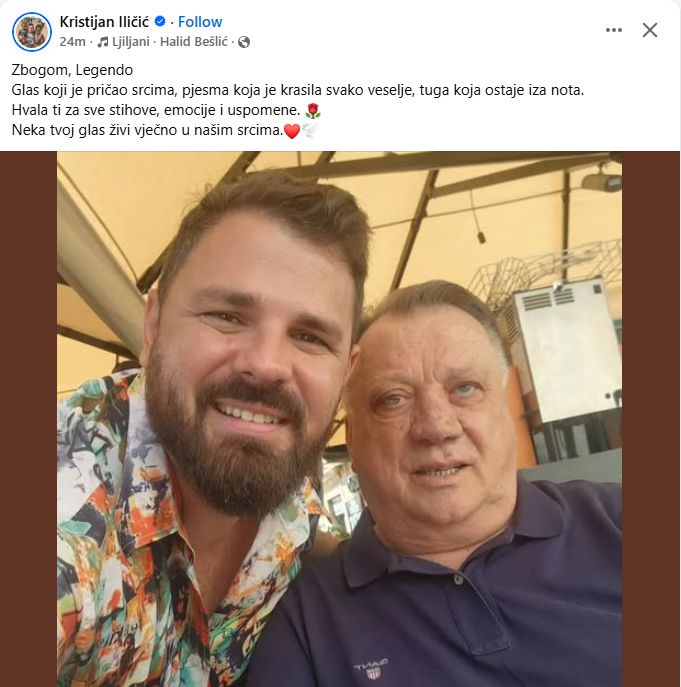 - Sa velikom tugom opraštamo se od Halida Bešlića. Umjetnika čije su pjesme bile dio naših života. Njegov glas i njegova ljudskost ostaće zauvijek u sjećanju. U ime moje porodice izdražavam saučešnje njegovoj porodici i najbližima - stajalo je u objavi Lepe Brene.