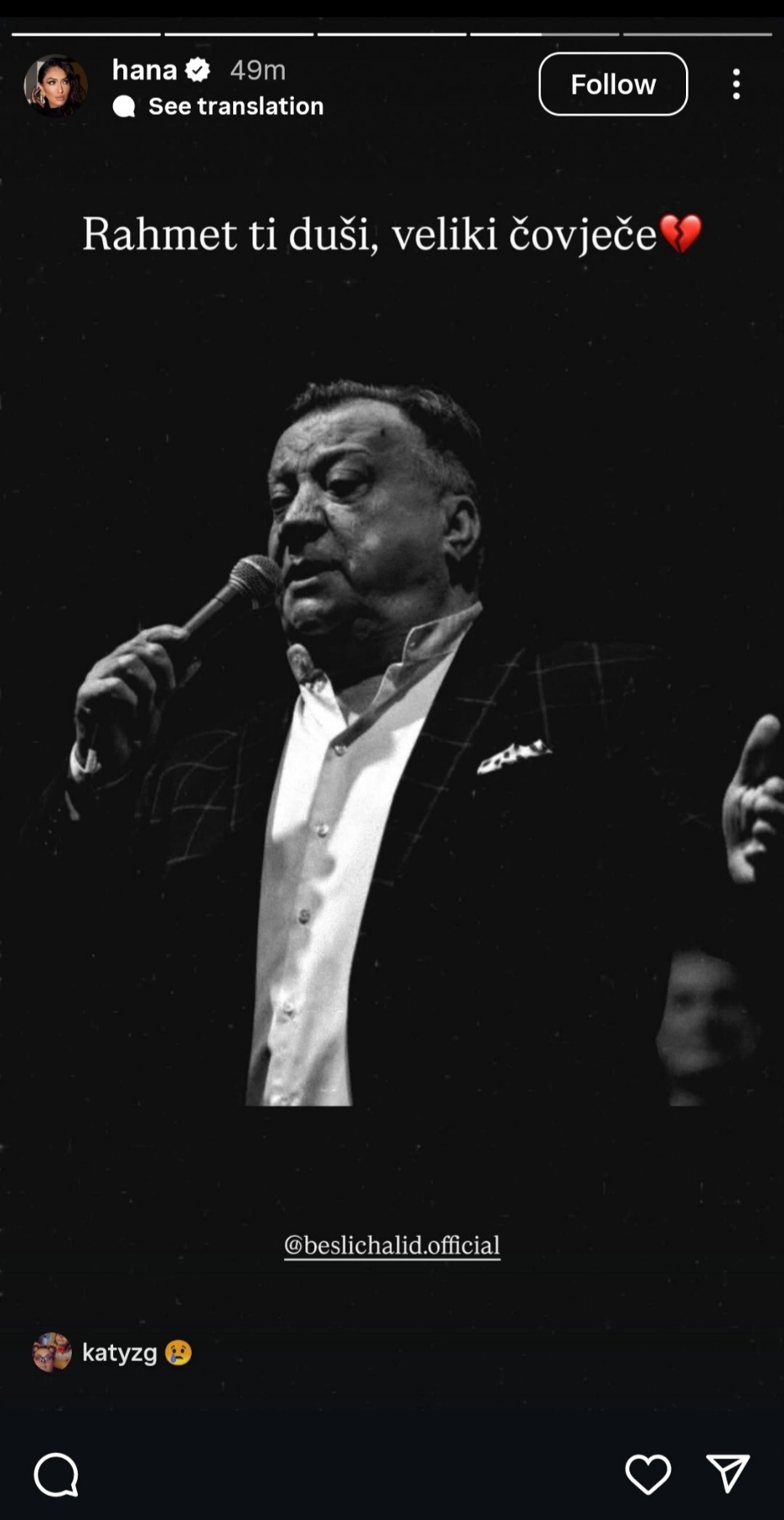 "Danas nas je napustio najveći od najvećih, a mi smo imali veliku čast i privilegiju da prije nekoliko godina otvorimo jedan od njegovih velikih koncerata. Hvala za sve. Rest in peace Halid Bešlić.