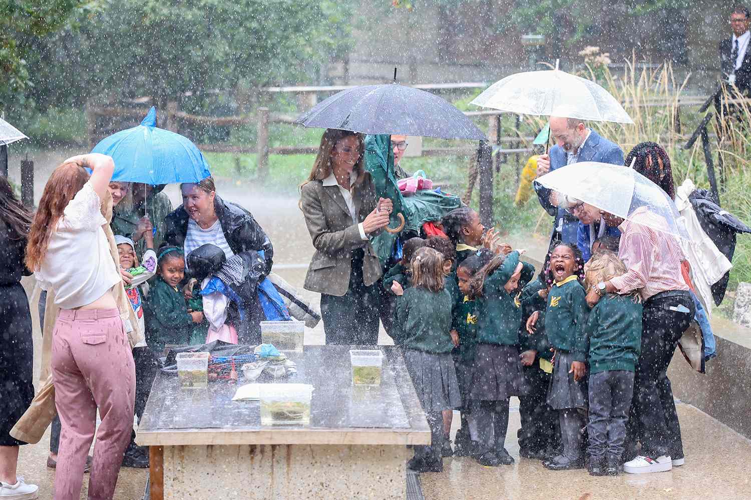 Tokom neformalnog druženja, ni iznenadna londonska kiša nije pokvarila atmosferu – par i učenici su se smijali dok su se zajedno skrivali pod kišobranima.