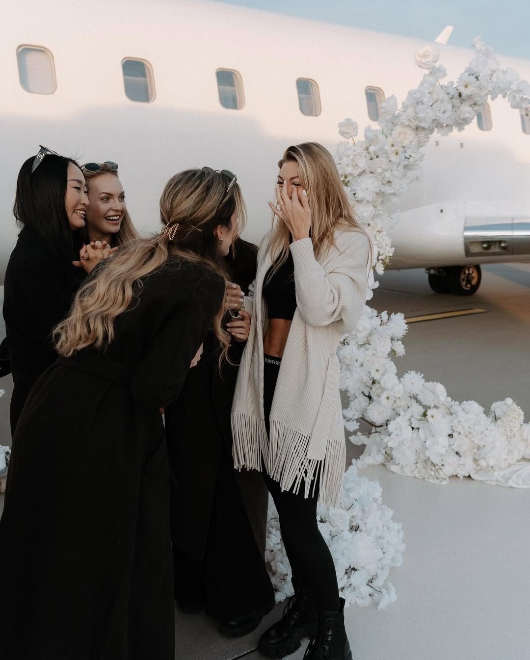 Bijeli tepih, vijenac od cvijeća i diskretna dekoracija stvorili su intimnu, ali luksuznu atmosferu. Uz ovo, par je proslavio trenutak uz šampanjac i delicije, u potpuno privatnom dijelu aviona, čime je vjeridba dobila notu ekskluzivnosti i elegancije.