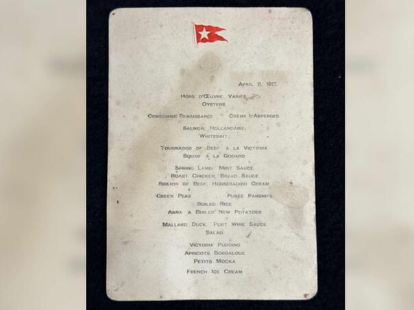 Jelovnik, koji je procijenjen na između 50.000 i 70.000 funti (između 57.000 i 79.000 eura), nudi za večeru ostrige, jagnjetinu sa nanom, patku u sosu sa vinom. Večera je servirana 11. aprila uveče, nekoliko dana prije potonuća.