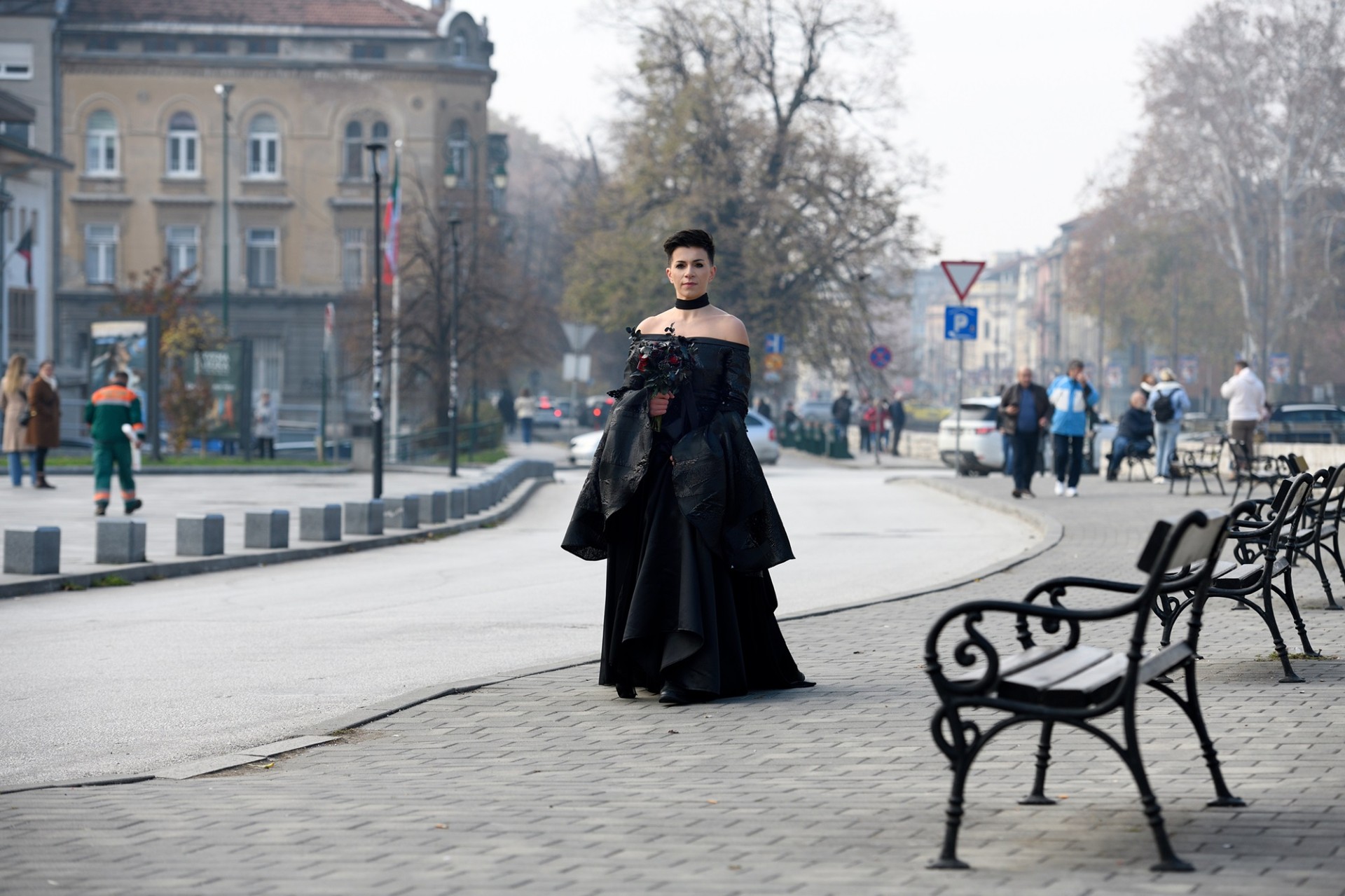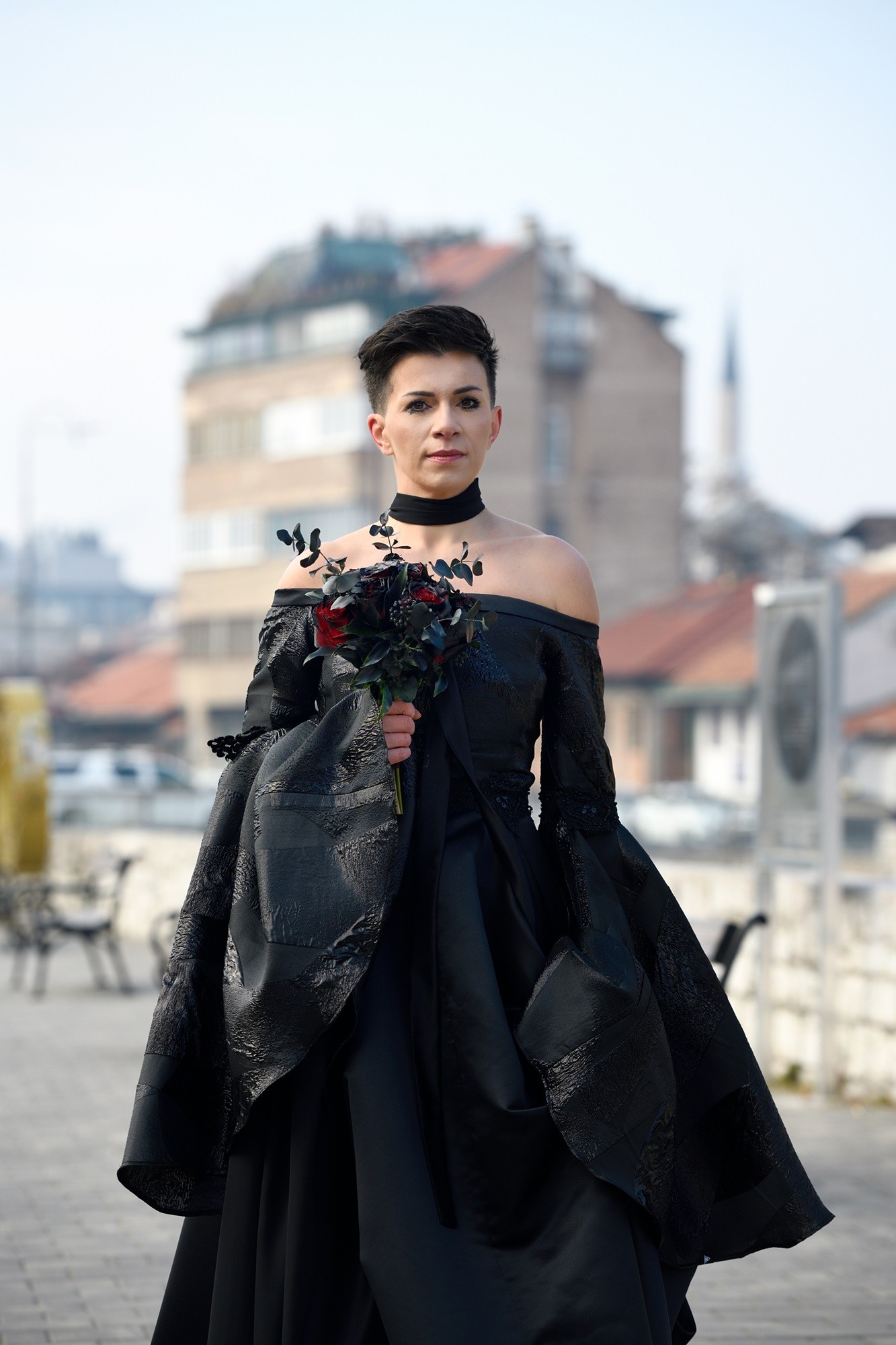 Prepoznatljivi elementi vjenčanice — voluminozni kroj, predimenzionirani rukavi i veo oko vrata — simbolizuju težinu, snagu i ograničenja s kojima se žene svakodnevno suočavaju, ali i oslobađanje kroz imenovanje i zaustavljanje nasilja.