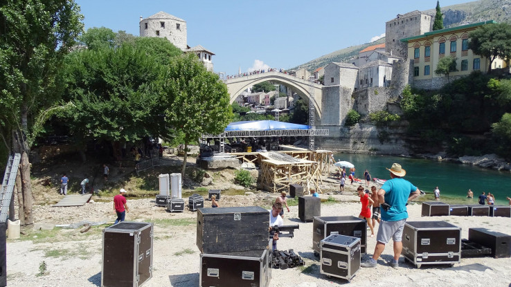 Uprkos nesnosnim vrućinama koje posljednjih dana haraju Mostarom, radnici su jučer ispod UNESCO-ovog dragulja neumorno montirali i postavljali opremu, a u gradu se već počela osjećati posebna atmosfera.
