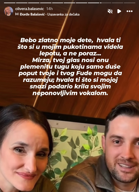 „Bebo, zlatno moje dijete, hvala ti što si u mojim pukotinama vidjela ljepotu, a ne poraz. Mirza, tvoj glas nosi onu plemenitu tugu koju samo duše poput tvoje i tvog Fude mogu razumjeti. Hvala ti što si mojoj snazi podario krila svojim neponovljivim vokalom“, poručila je.
