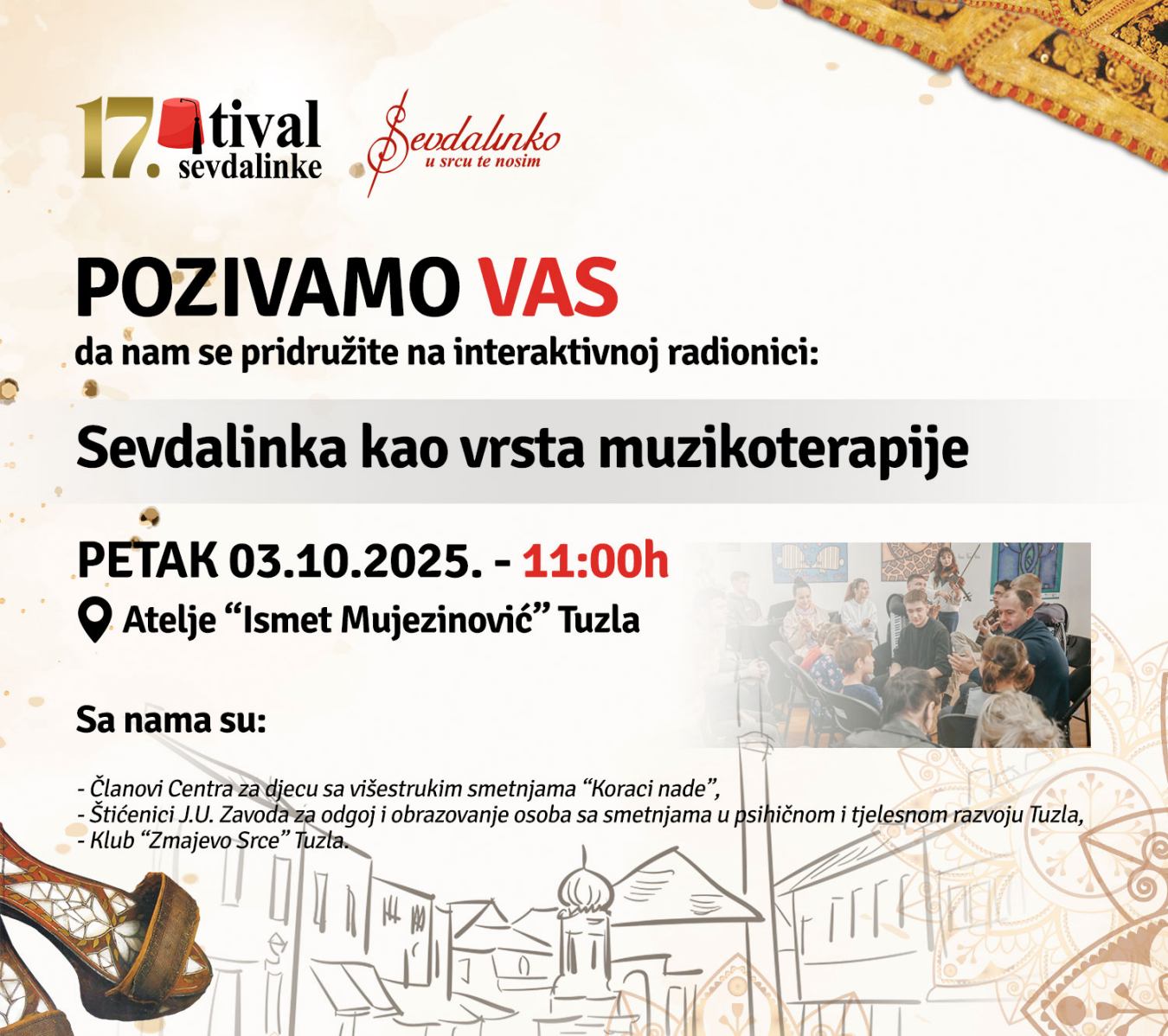 Sutra će u Tuzli biti održana radionica „Sevdalinka kao vrsta muzikoterapije“ u Ateljeu „Ismet Mujezinović“, s početkom u 11 sati.