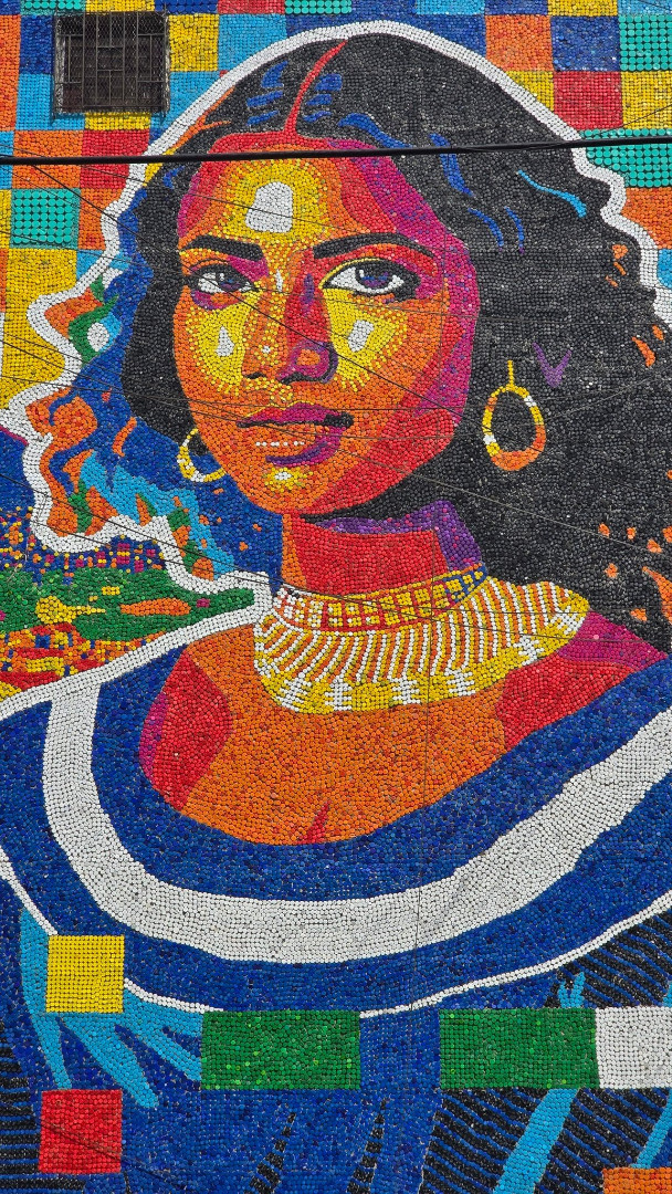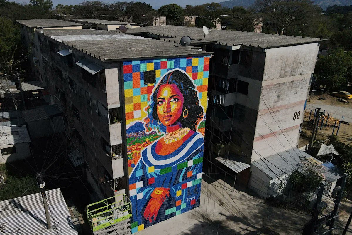 Masivni mural napravljen od plastičnih čepova za flaše prikazuje latinoameričku verziju čuvene Mona Lise, kraseći skromnu stambenu zgradu u radničkom naselju izvan glavnog grada Salvadora.