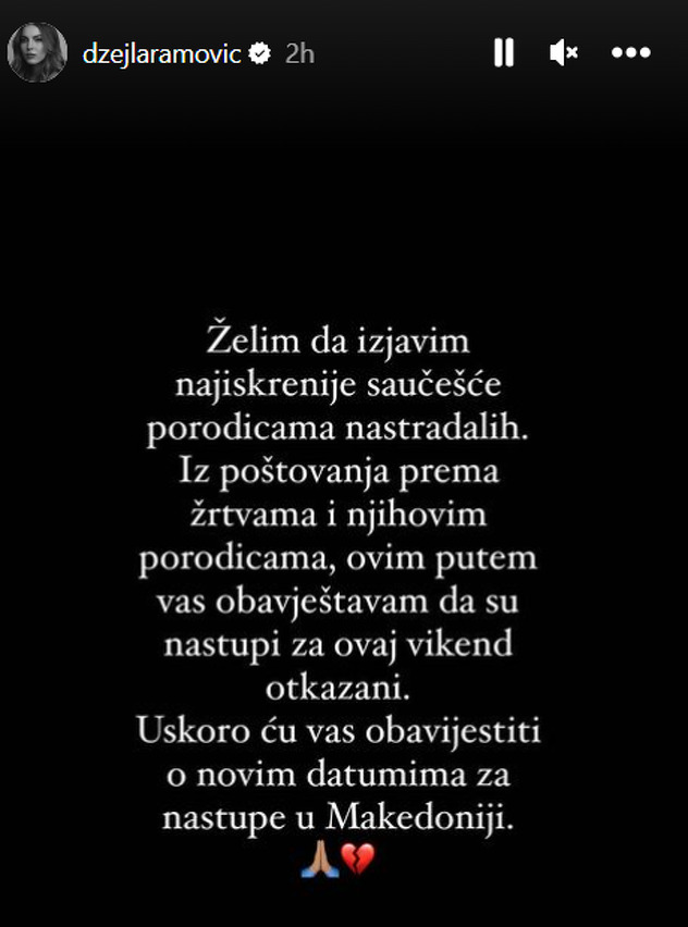 "Želim da izjavim najiskrenije saučešće porodicama nastradalih. Iz poštovanja prema žrtvama i njihovim porodicama, ovim putem vas obavještavam da su nastupi za ovaj vikend otkazani", napisala je Džejla.