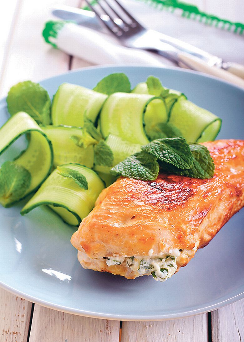 Pileća prsa zarežite nožem po sredini, tako da napravite džepić kako biste ih mogli puniti. Nasjeckajte listiće bosiljka i majčine dušice, a feta sir na kockice, pa sve to izmiješajte pa napunite piletinu. Ukoliko bude potrebe pileća prsa možete zatvoriti čačkalicom. Izvana meso pospite crvenom paprikom i pustite da odstoji nekoliko minuta. U tavu stavite 2 kašike maslinovog ulja pa na tome pecite odreske po 2 minute sa svake strane. Šporet zagrijte na 180 stepeni, a u nauljeni pleh za pečenje stavite odreske i pecite ih oko 20 minuta. Tikvice izrežite na tanke kriškice, pa ih prije serviranja poslužite uz piletinu. Tikvice se serviraju sirove uz dodatak limunovog soka.