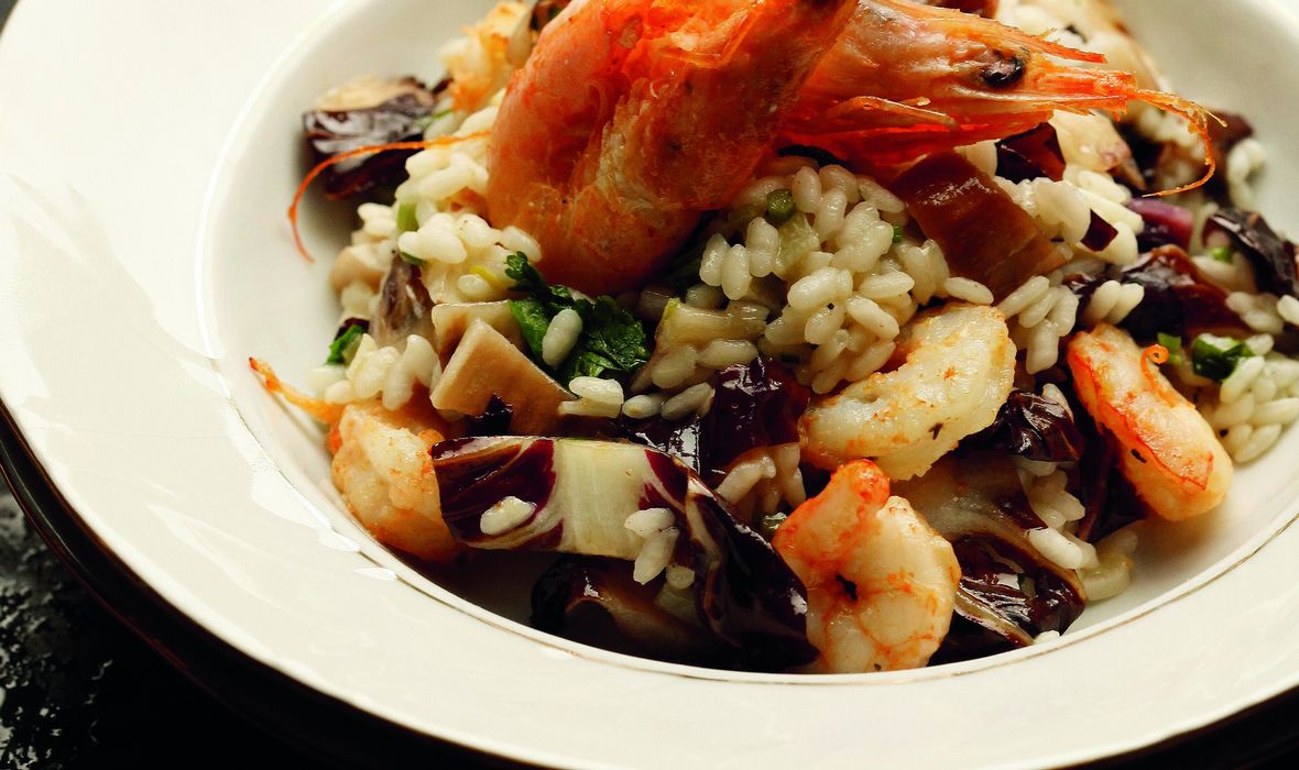 Radič isijecite na šire trake, a kozice očistite, te ostavite nekoliko neočišćenih. U dublju tavu stavite mješavinu maslinovog ulja i pola kašike putera u koje ćete dodati jedno čehno bijelog luka i rižu da se malo proprže. Rižu zalijte temeljcem, a pošto riža brzo pije tekućinu podlijevajte je još nekoliko puta. Kada je riža polu kuhana dodajte u nju tamjan, peršunov list i bijelo vino, a nekoliko minuta poslije dodajte i radič. Kozice ispecite u posebnoj tavi pa ih dodajte rižotu, sve posolite i pobiberite te dodajte puter, pa izmiješajte. Ovaj recept najbolje je servirati odmah.