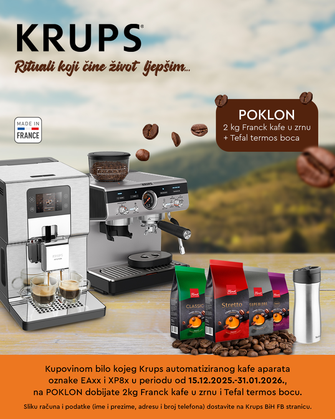 U periodu od 15.12. do 31.1.2026., svi kupci Krups premium kafe aparata s oznakama EAxx i XP8x imaju priliku ostvariti atraktivne poklone koji upotpunjuju savršeni ritual ispijanja kafe.