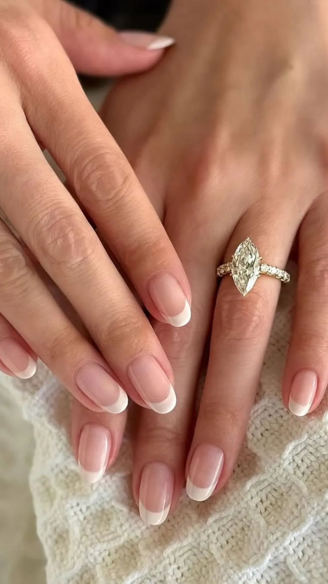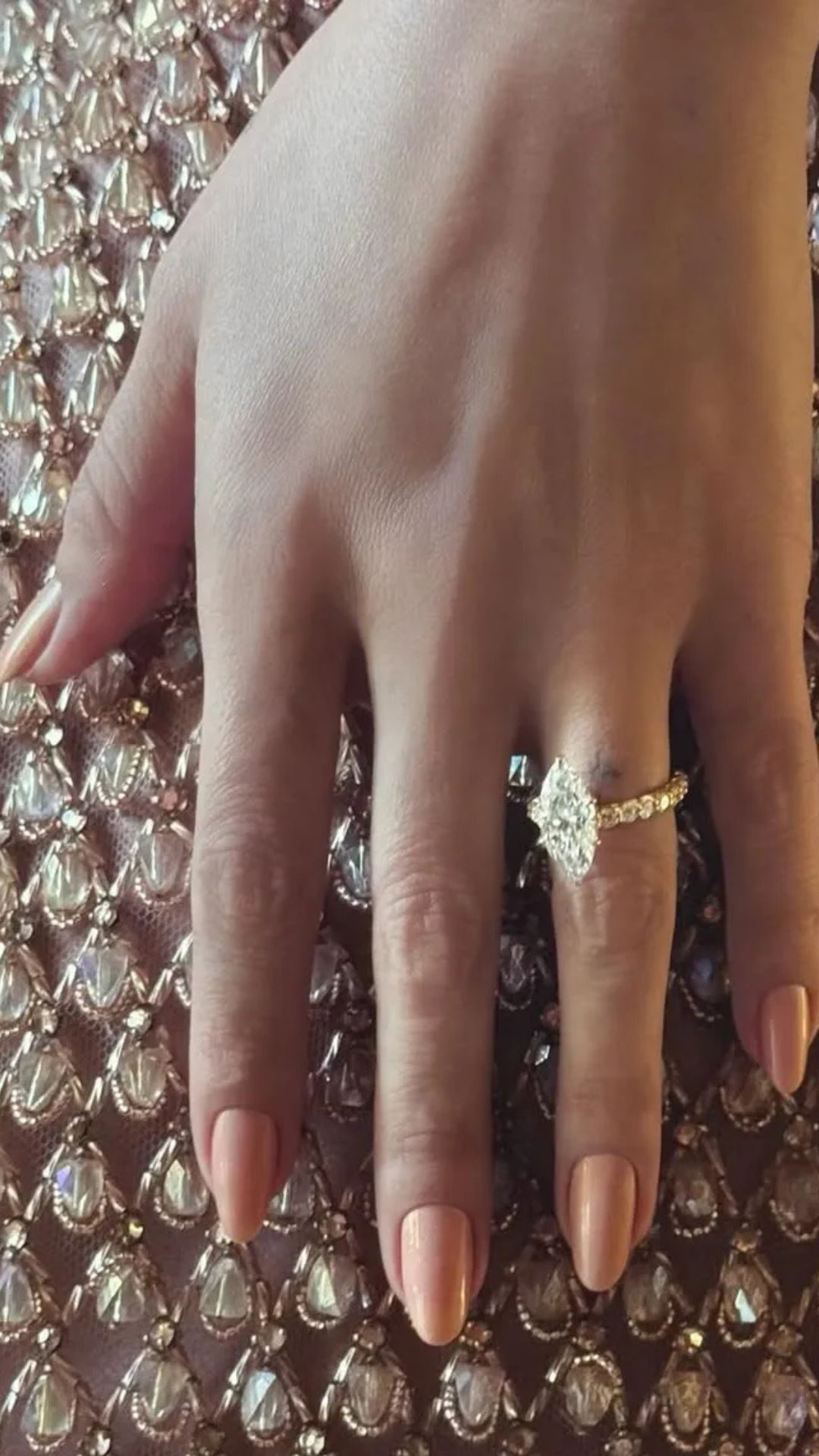 Ovakav uredan i elegantan manikir dodatno naglašava ljepotu njenog zaručničkog prstena sa šest karata u obliku marquise dijamanta i pavé detaljima.