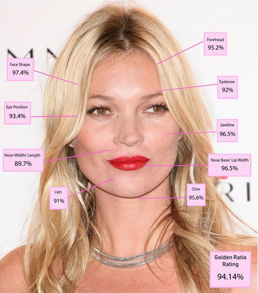 Sada 51-godišnja Moss je najbliža "savršenstvu" prema ideji starih Grka, temeljeći se na njenoj besprijekornoj poziciji očiju, obliku lica, osnovi nosa/širini usana i, naravno, liniji čeljusti.
