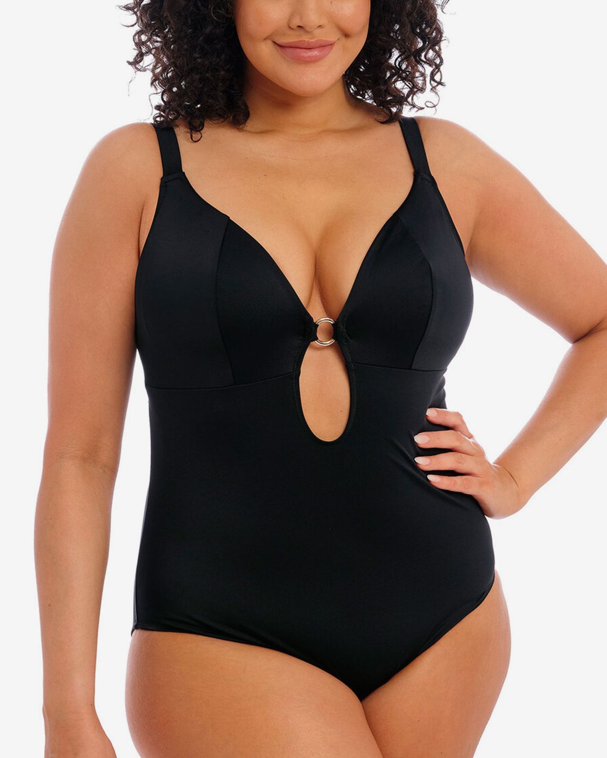 Podesive naramenice, duboki izrez i metalni prsten čine ovaj crni jednodijelni model istovremeno udobnim i zavodljivim. Veličine do 42.