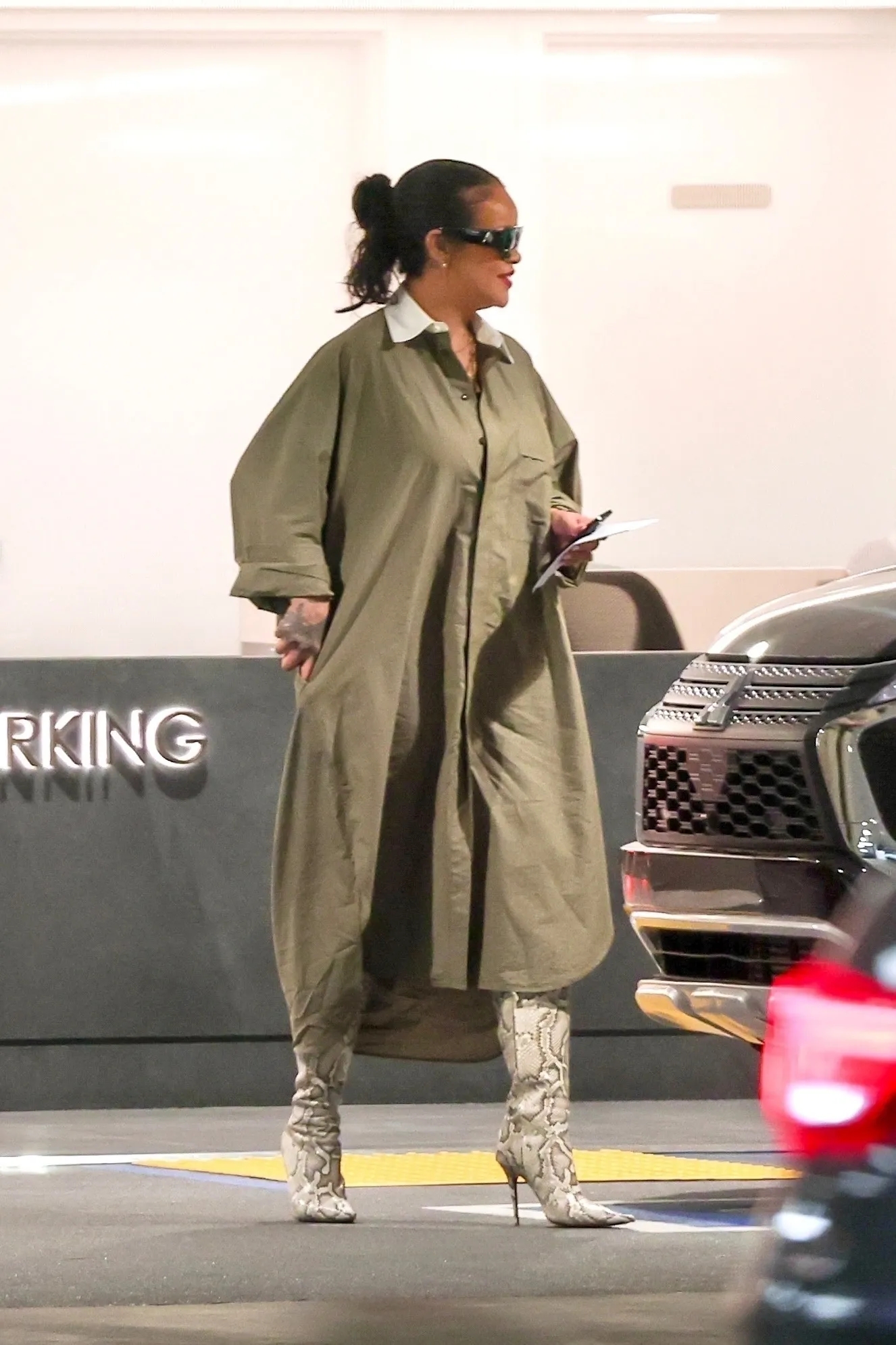 Jedan od najvećih trendova jeseni i zime 2025. godine ujedno je i omiljeni izbor Rihanne. Čizme s visokom potpeticom i zmijskim uzorkom, viđene na modnim pistama, Rihanna je uspješno prenijela u svakodnevne kombinacije — noseći ih uz lepršave mantil-haljine i krojena odijela. Iako djeluju upečatljivo, iznenađujuće su neutralne i lako se uklapaju uz crnu, smeđu i brojne druge boje.