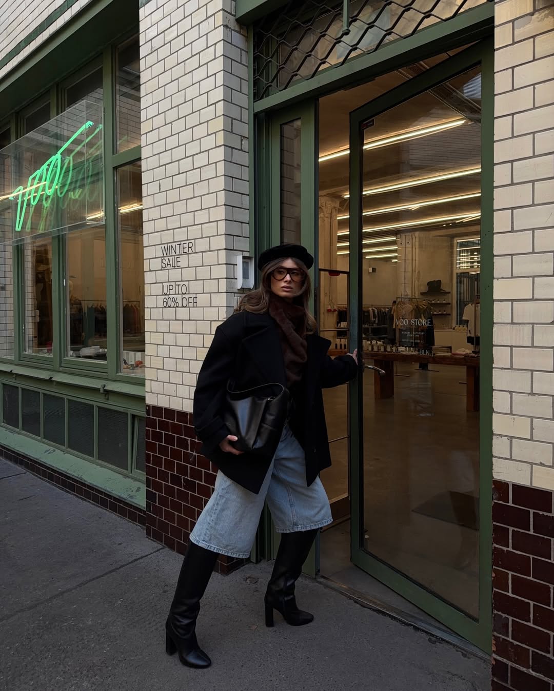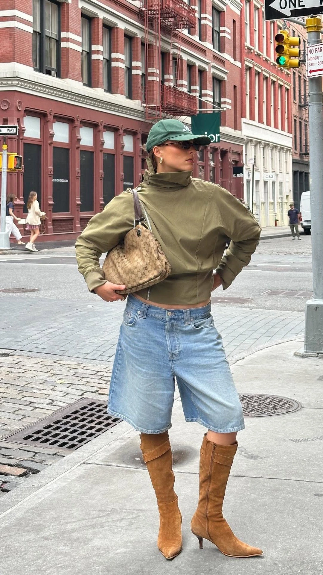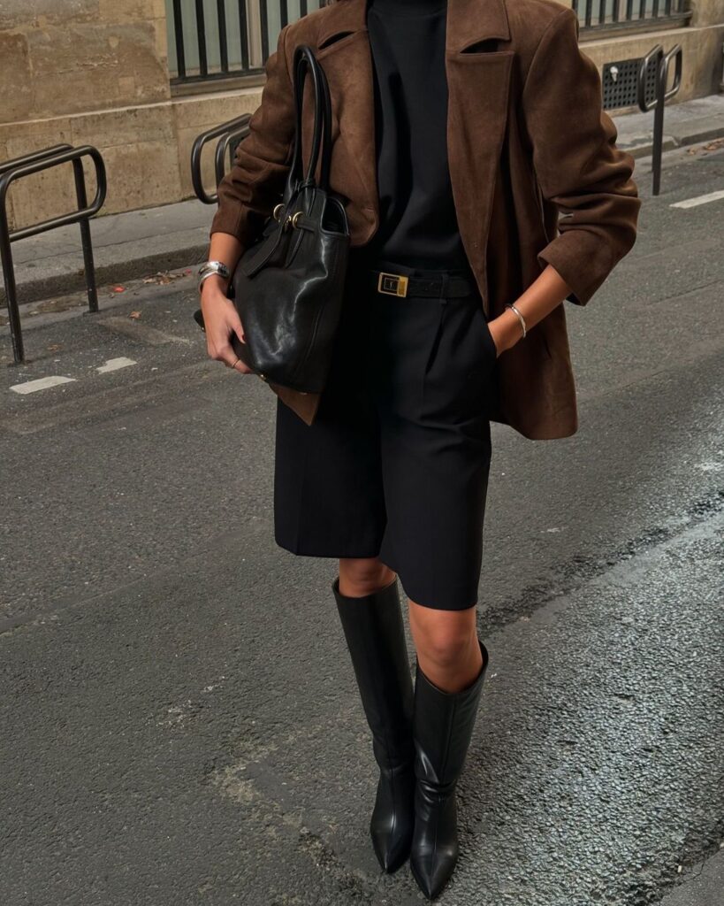 Bermude otkrivaju nogu i unose lakoću u outfit, dok čizme dodaju strukturu i dozu ozbiljnosti. Rezultat je balans koji izgleda promišljeno, a opet opušteno.