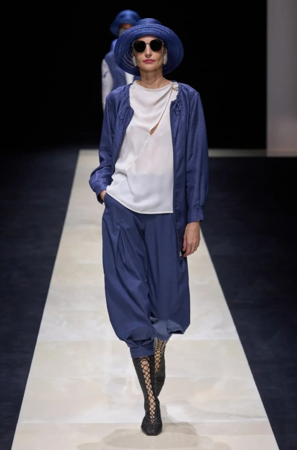 Na pisti Emporio Armanija capri hlače su dobile novu formu - reinterpretirane kao "bombacho" kroj u kombinaciji s čipkastim čizmama na vezanje. Ovaj spoj ženstvenog i utilitarnog idealan je za one koji vole eksperimentisati s teksturama.