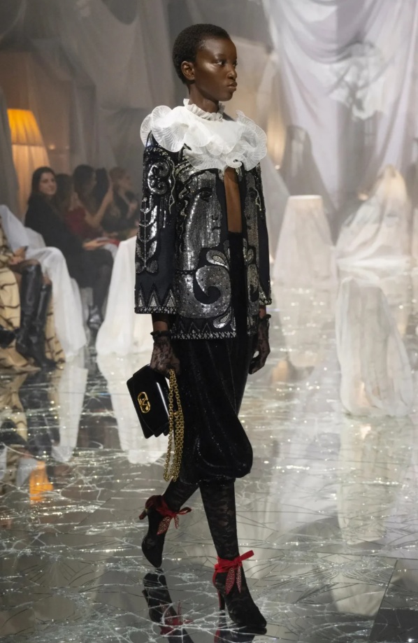 U kolekciji Valentina za proljeće/ljeto 2025., capri od baršuna predstavljene su kao večernji komad i to uparen s bluzom od šljokica i salonkama s kaišem. Ovaj look definiše pojam savremene elegancije i daje jasan odgovor: capri hlače mogu biti dovoljno svečane za svaku ljetnu večer.