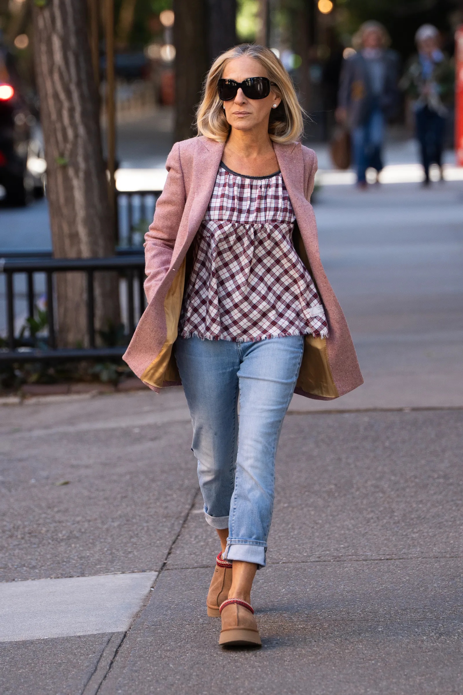 U prepoznatljivom stilu, Parker je spojila udobno i chic: kariranu tuniku babydoll kroja nosila je ispod ružičastog kaputa dužine do bedara, dok su svijetloplave traperice, zavrnute do listova, naglasile njezin izbor obuće.